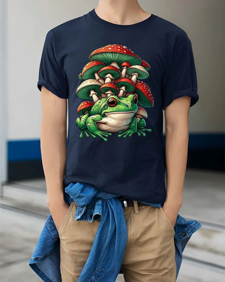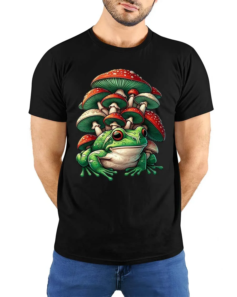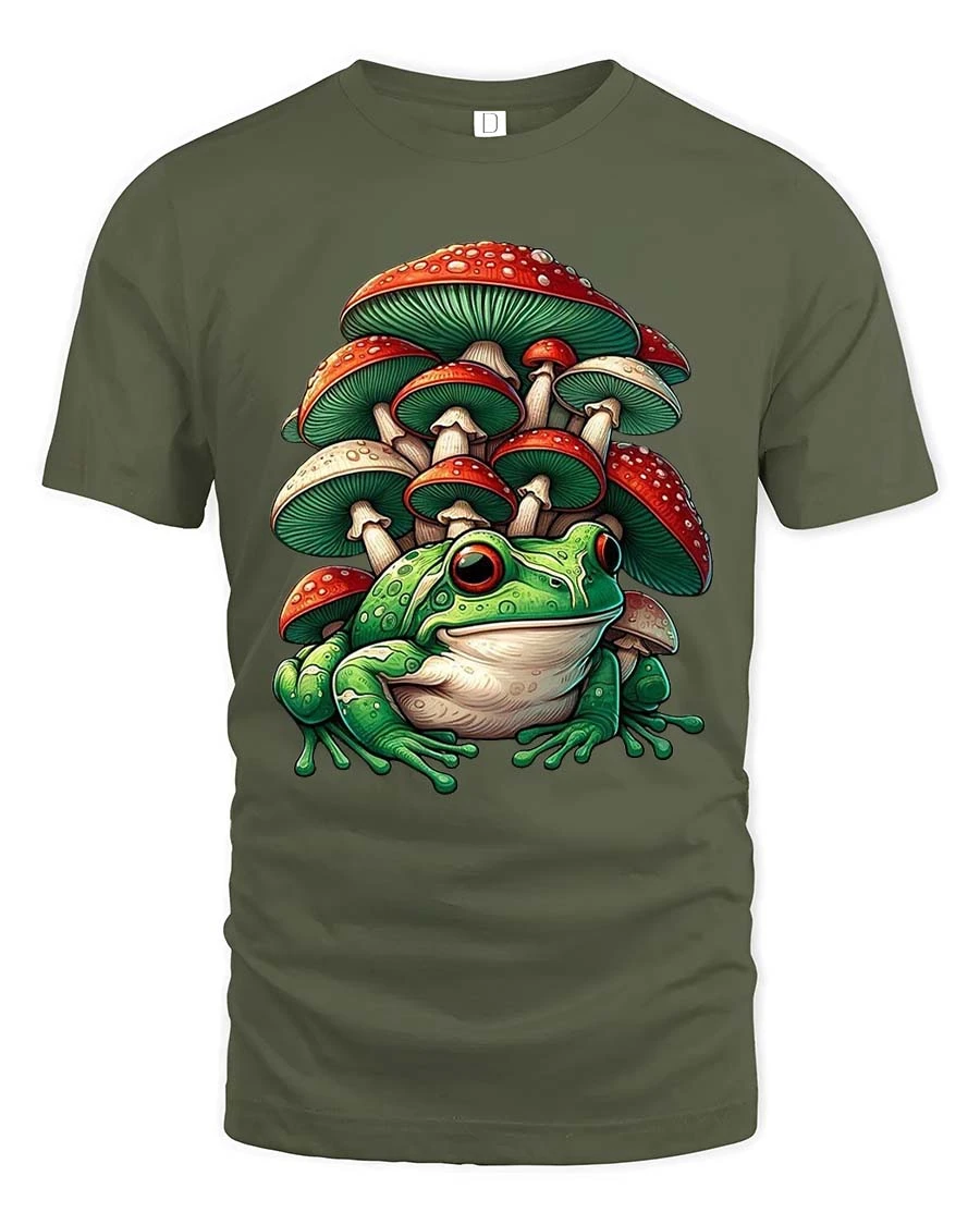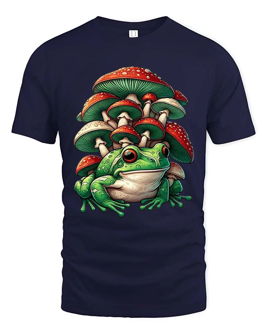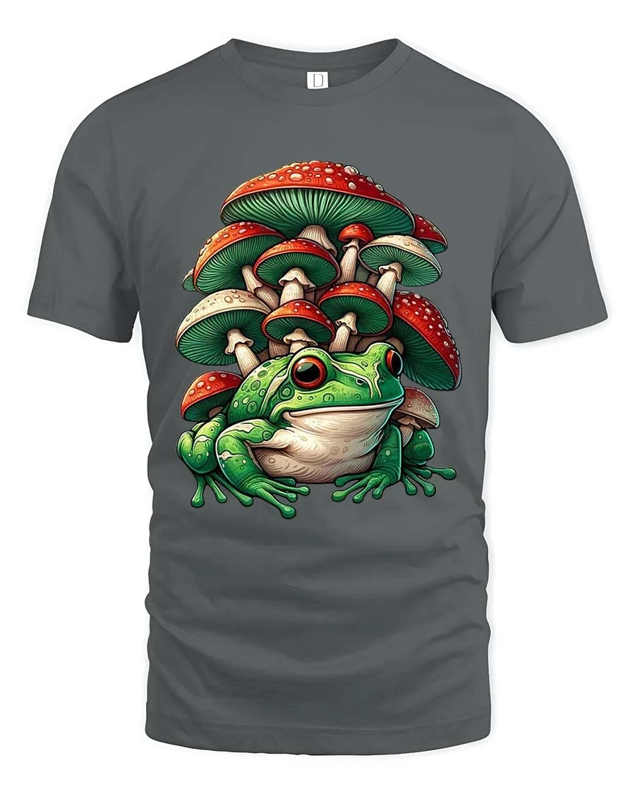 Cute Frog Mushroom T Shirt Fantasy Nature Cartoon Graphic Tee captures the charm of a magical forest scene with a playful and artistic touch.