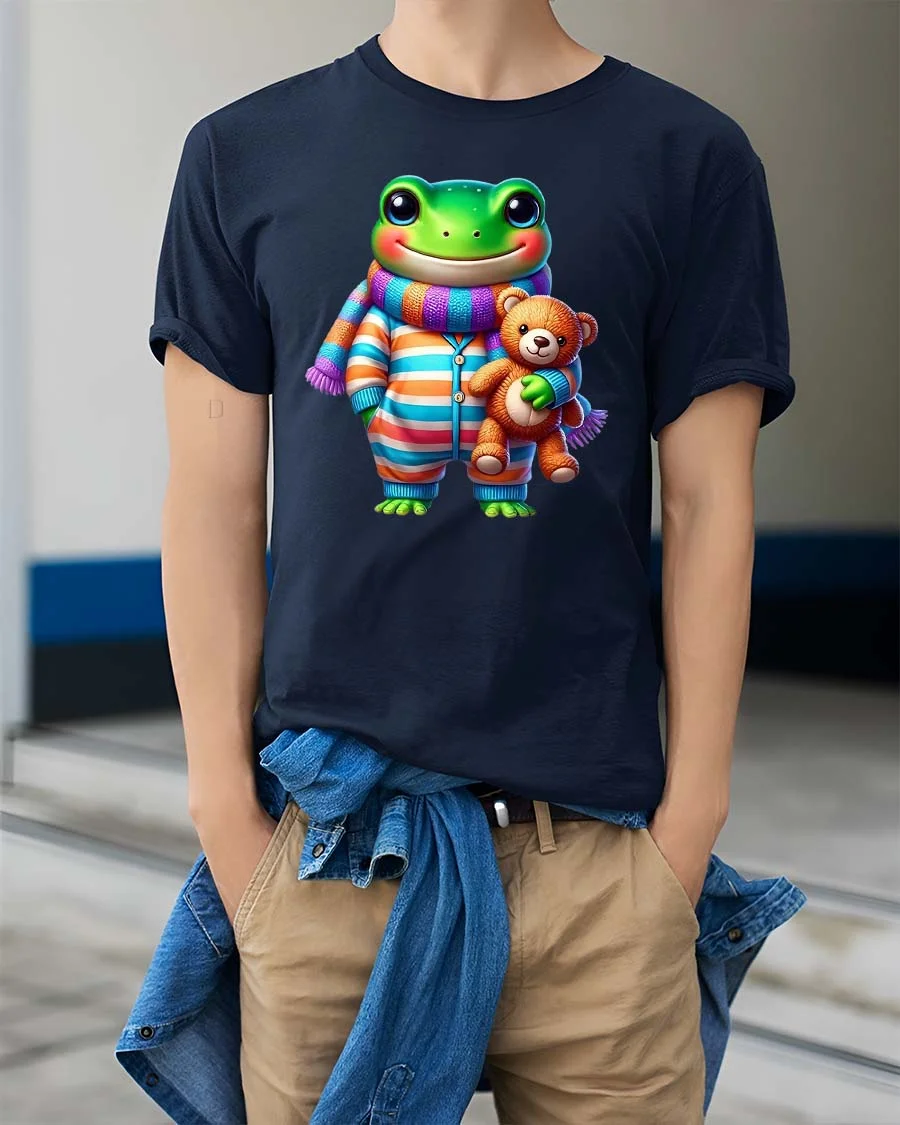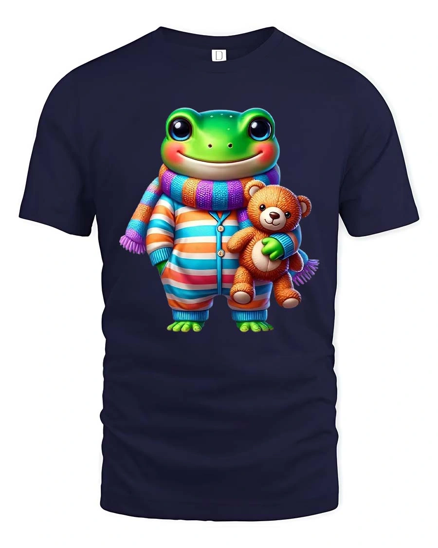 The charming frog character dressed in colorful pajamas and a cozy scarf while holding a soft teddy bear creates a playful and comforting vibe that makes the design stand out in a fun and unique way.