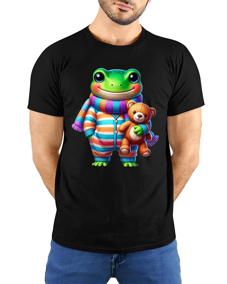Cute Frog Pajama Buddy Teddy Bear Cartoon Graphic T Shirt brings a joyful and heartwarming cartoon style that instantly catches attention with its bright colors and adorable character design.