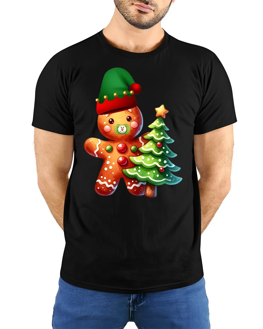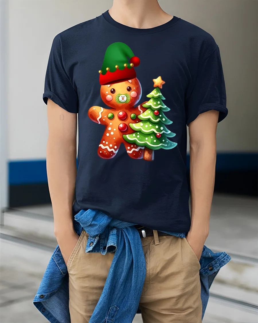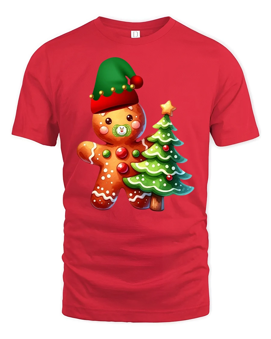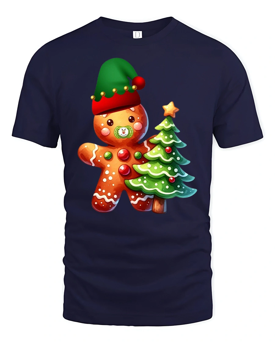 Cute Gingerbread Tee brings cheerful holiday fun with its colorful gingerbread character and bright Christmas tree design. The artwork features a smiling gingerbread cookie wearing a festive elf hat, decorated with candy buttons and sweet holiday accents. Paired with a beautifully detailed Christmas tree topped with a glowing star, this tee captures the joyful magic of the season in a charming and playful way.