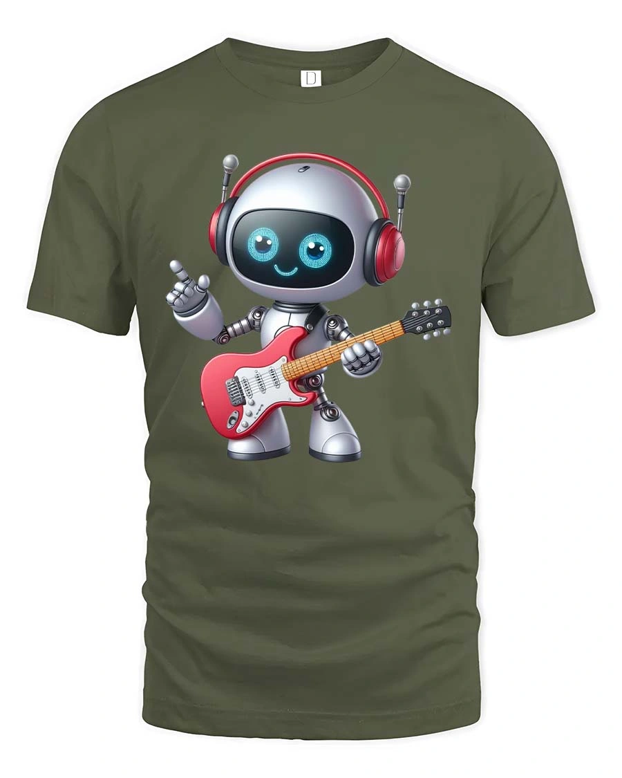 Cute Guitar Playing Robot Cartoon Music Lover Graphic T Shirt - military green t-shirt on white background