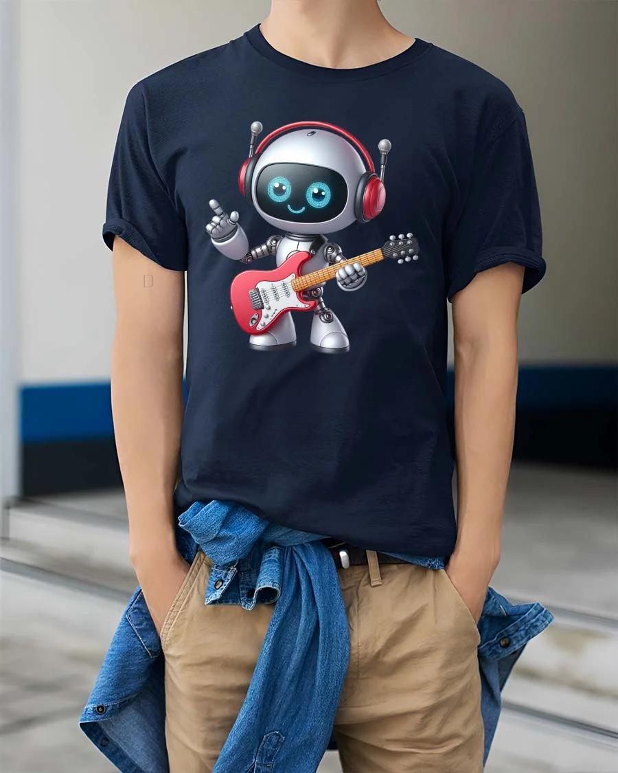 Cute Guitar Playing Robot Cartoon Music Lover Graphic T Shirt - model wearing navy tee with hands in pockets
