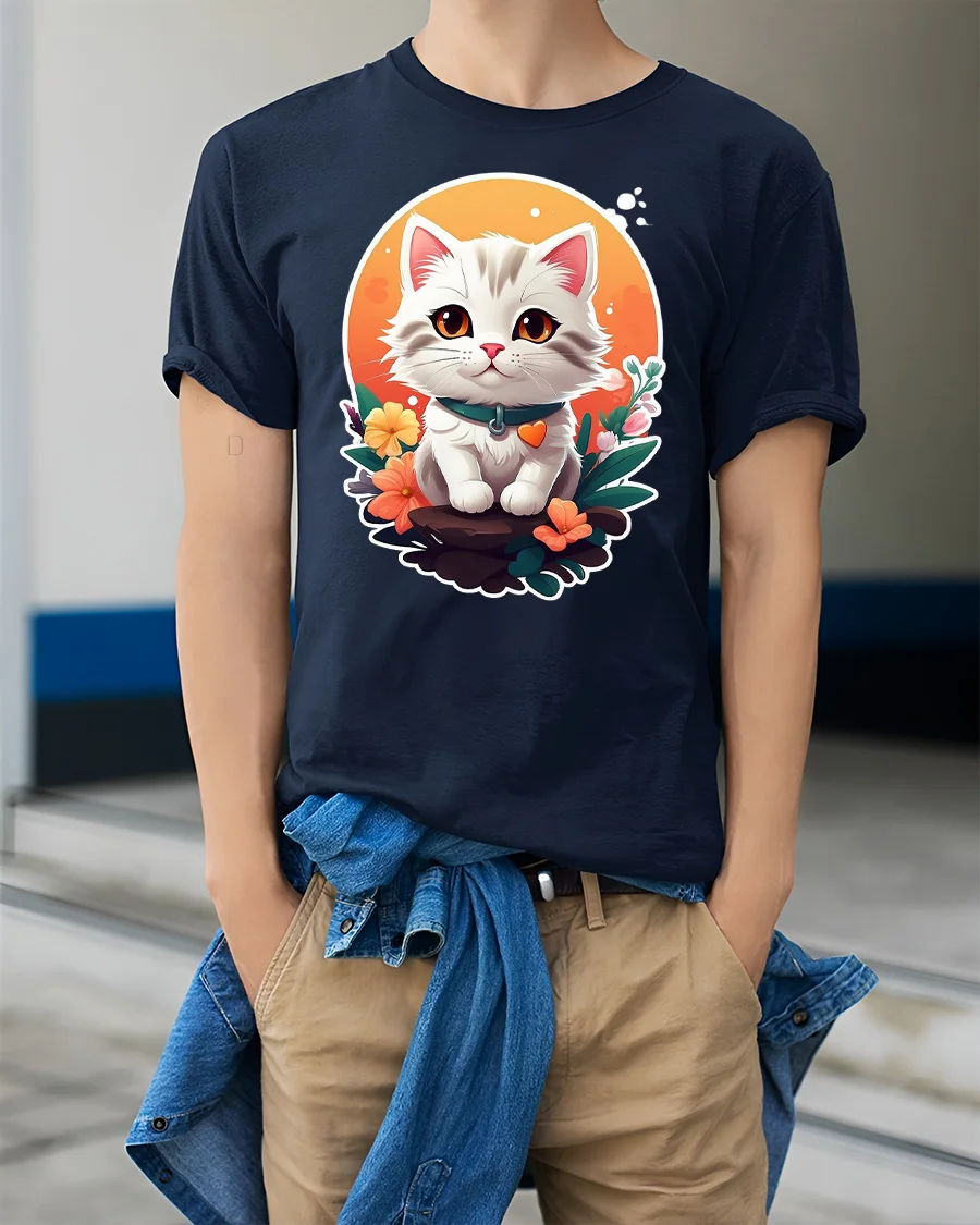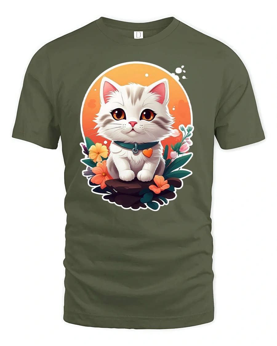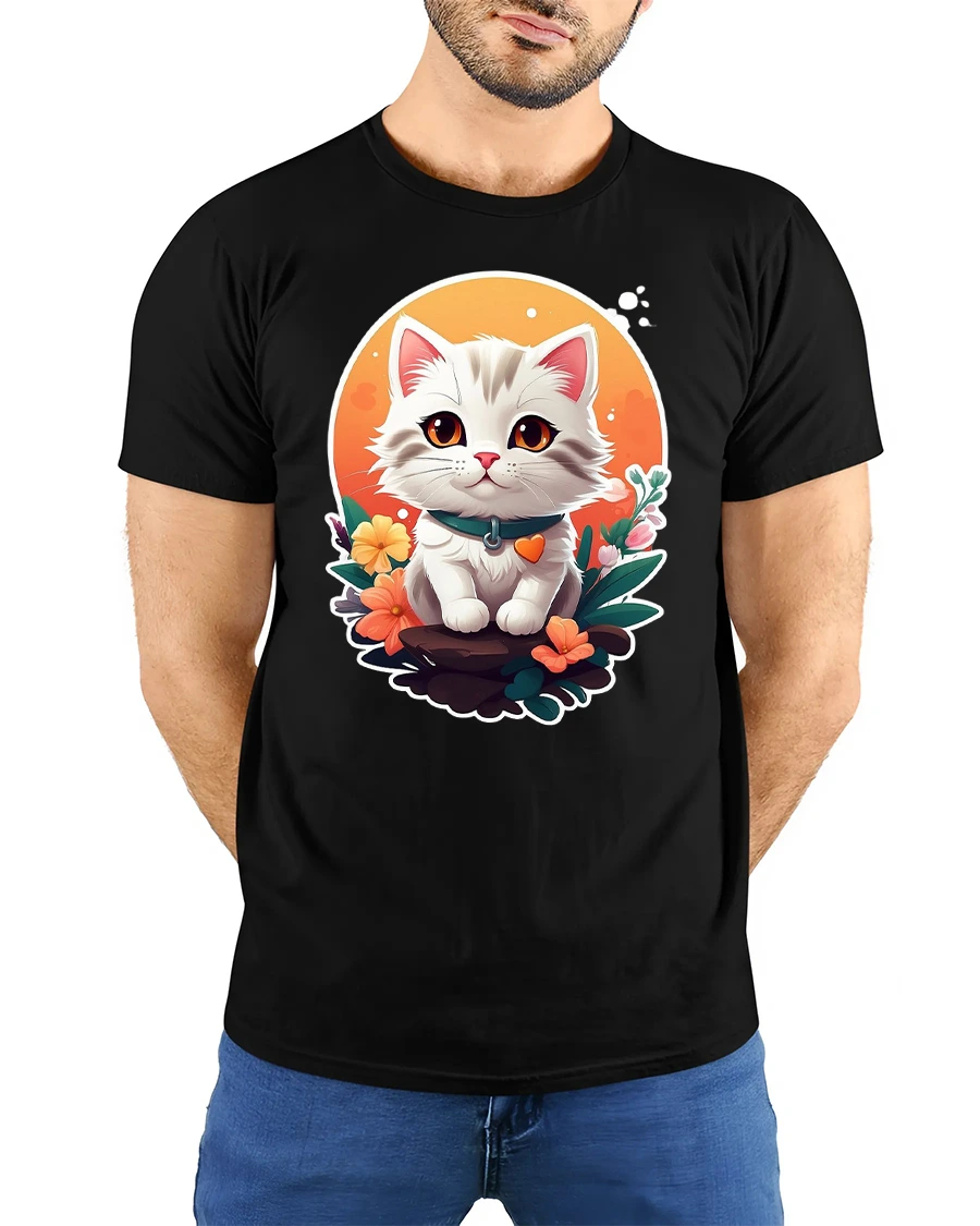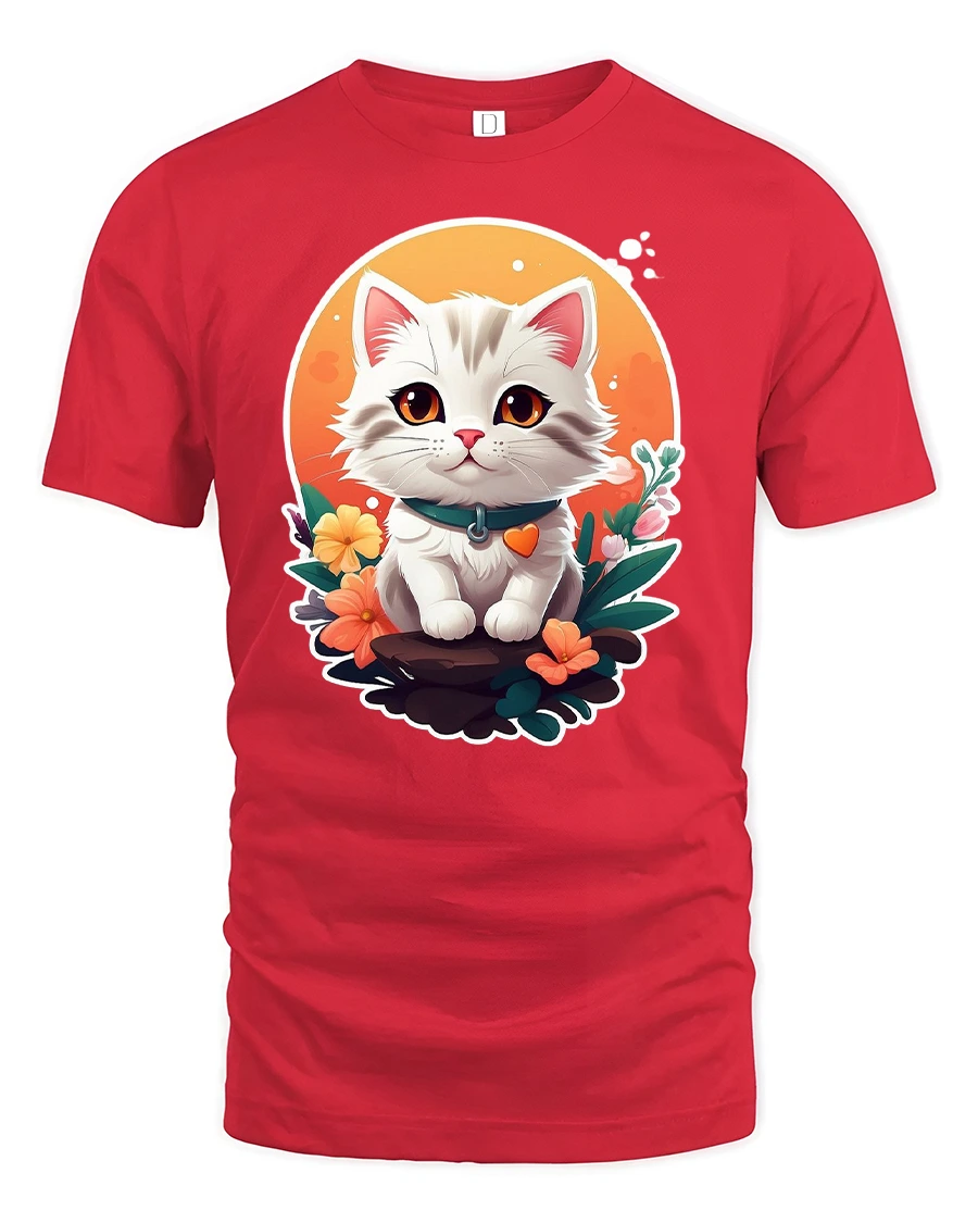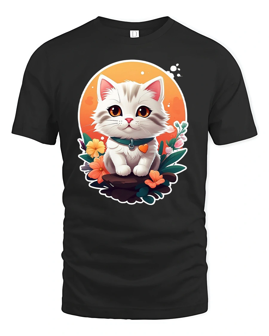 Featuring a sweet white kitten surrounded by bright flowers and a warm sunset background, this tee adds a touch of love and joy to your everyday style.