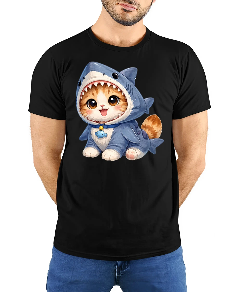 Designed with everyday comfort in mind, the Cute Kitten Wearing Shark Costume Adorable Cartoon Graphic T Shirt Tee feels soft, breathable, and easy to wear throughout the day.