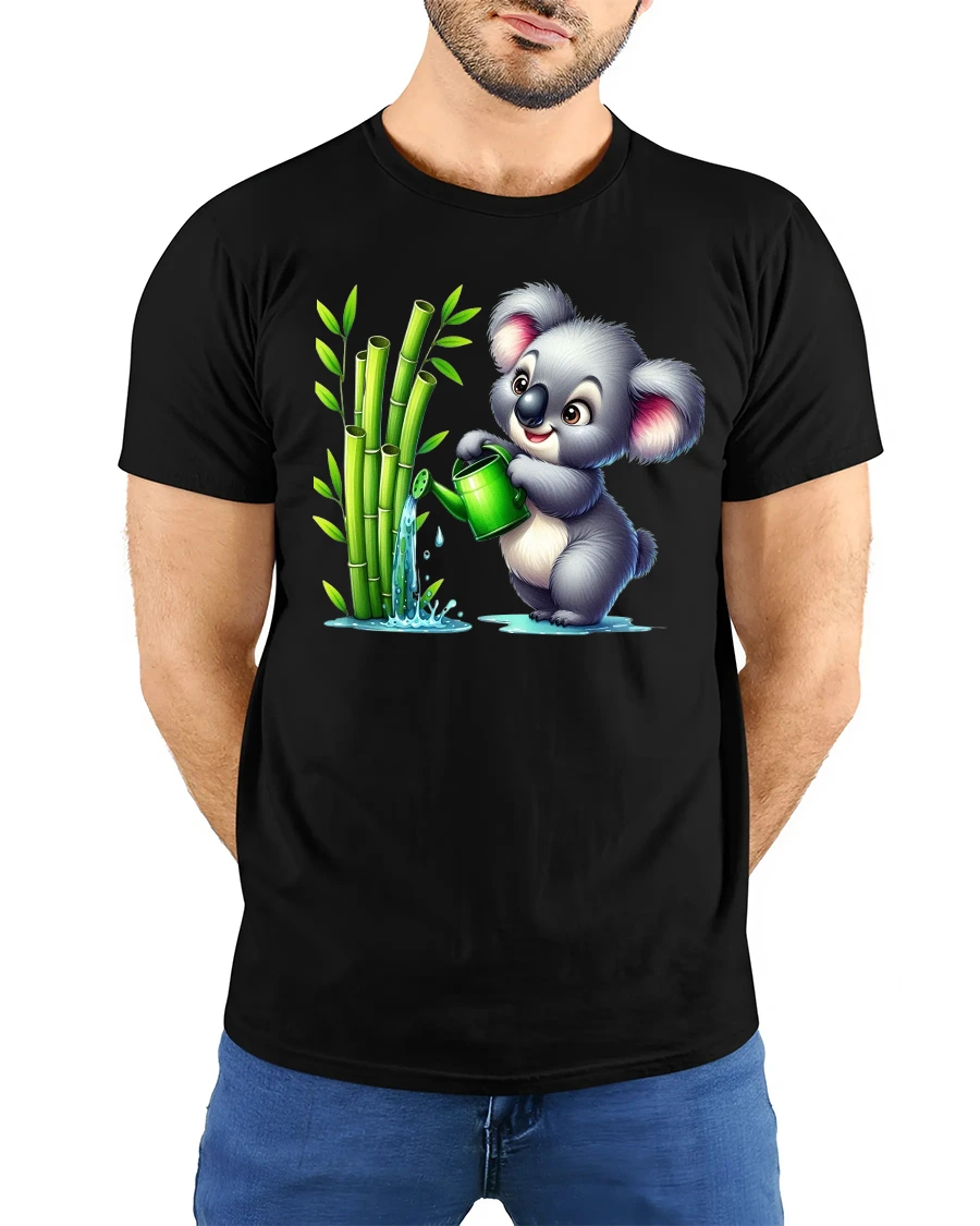 This tee features a playful koala holding a green watering can, happily nurturing a patch of bamboo — a perfect symbol of care, growth, and positivity.