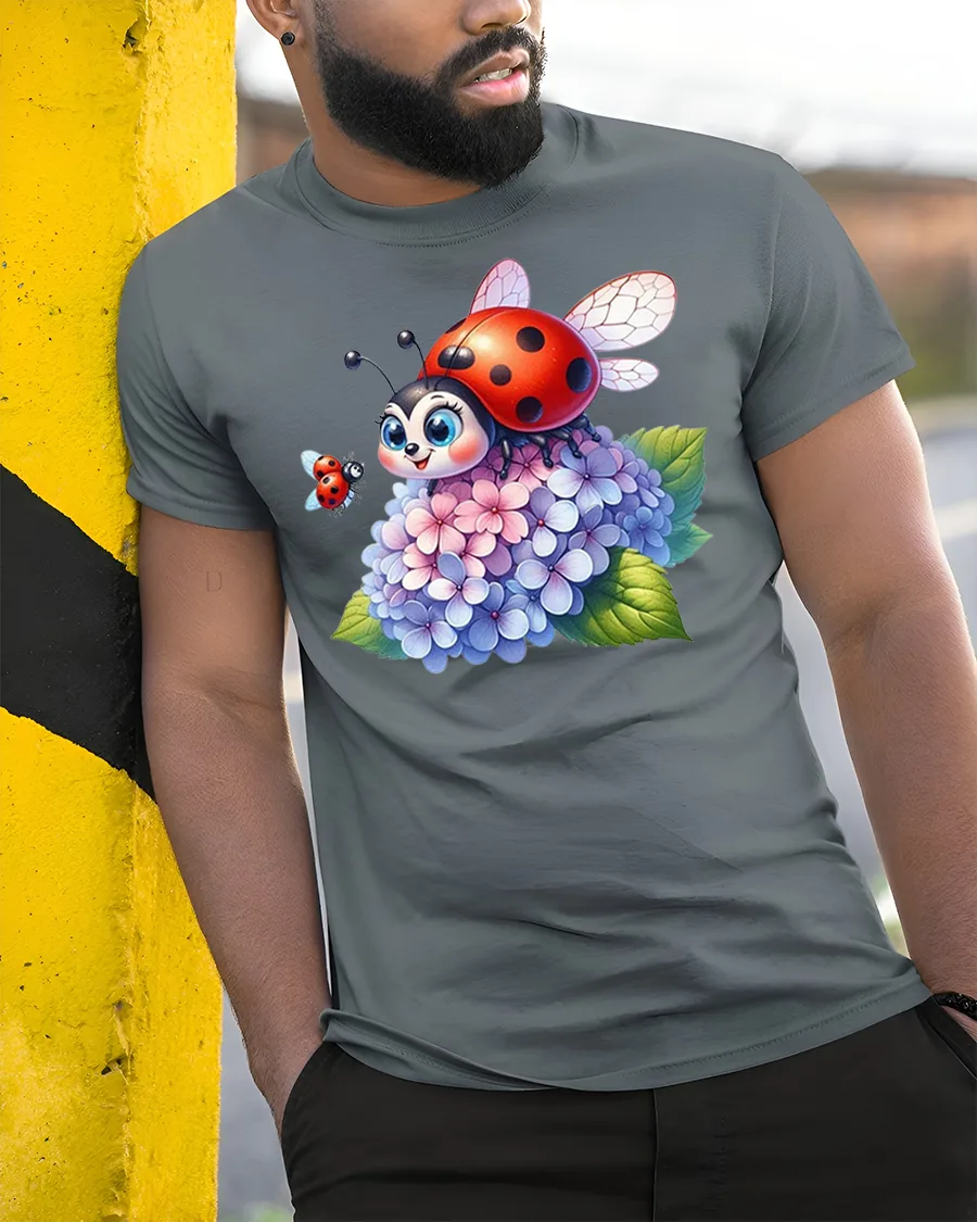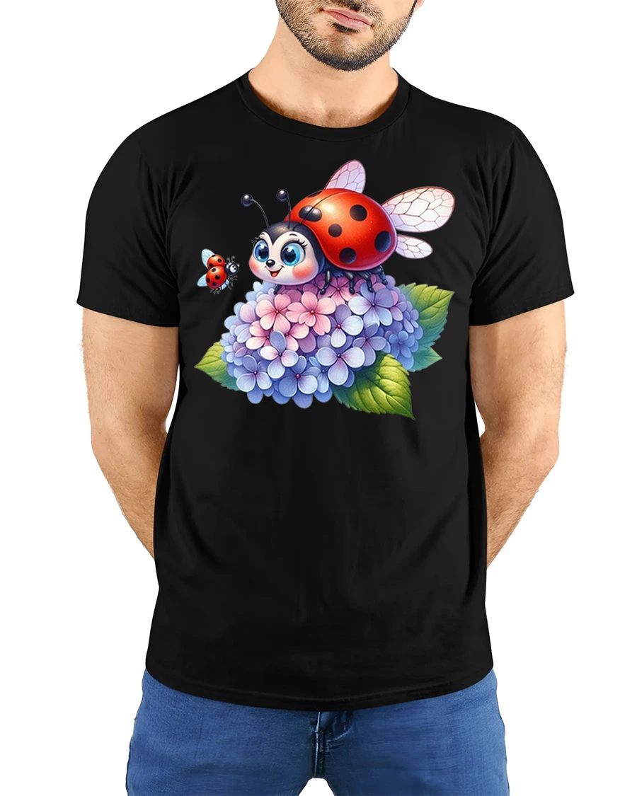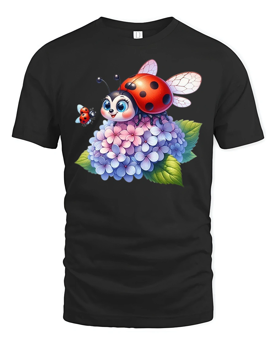 The Cute Ladybug On Hydrangea Flowers Cartoon Art Graphic Tee Shirt brings a soft joyful feeling inspired by nature and charm.
