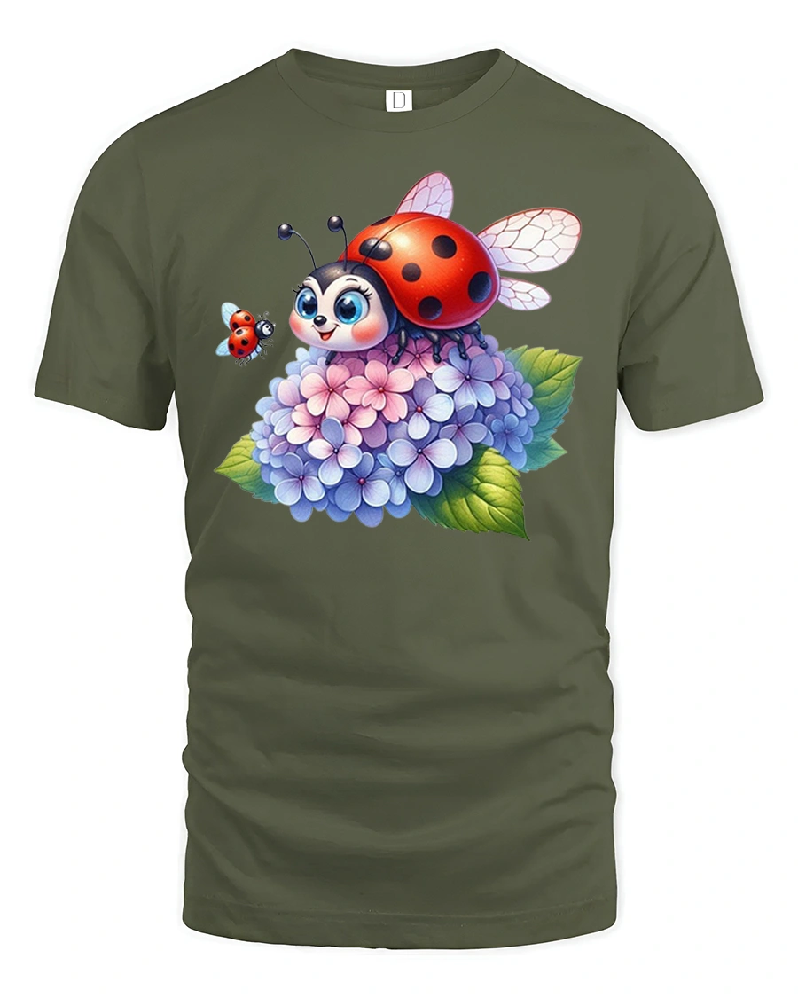 Cute Ladybug On Hydrangea Flowers Cartoon Art Graphic Tee Shirt - military green t-shirt on white background