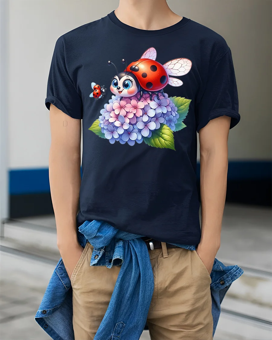 Cute Ladybug On Hydrangea Flowers Cartoon Art Graphic Tee Shirt - model wearing navy tee with hands in pockets