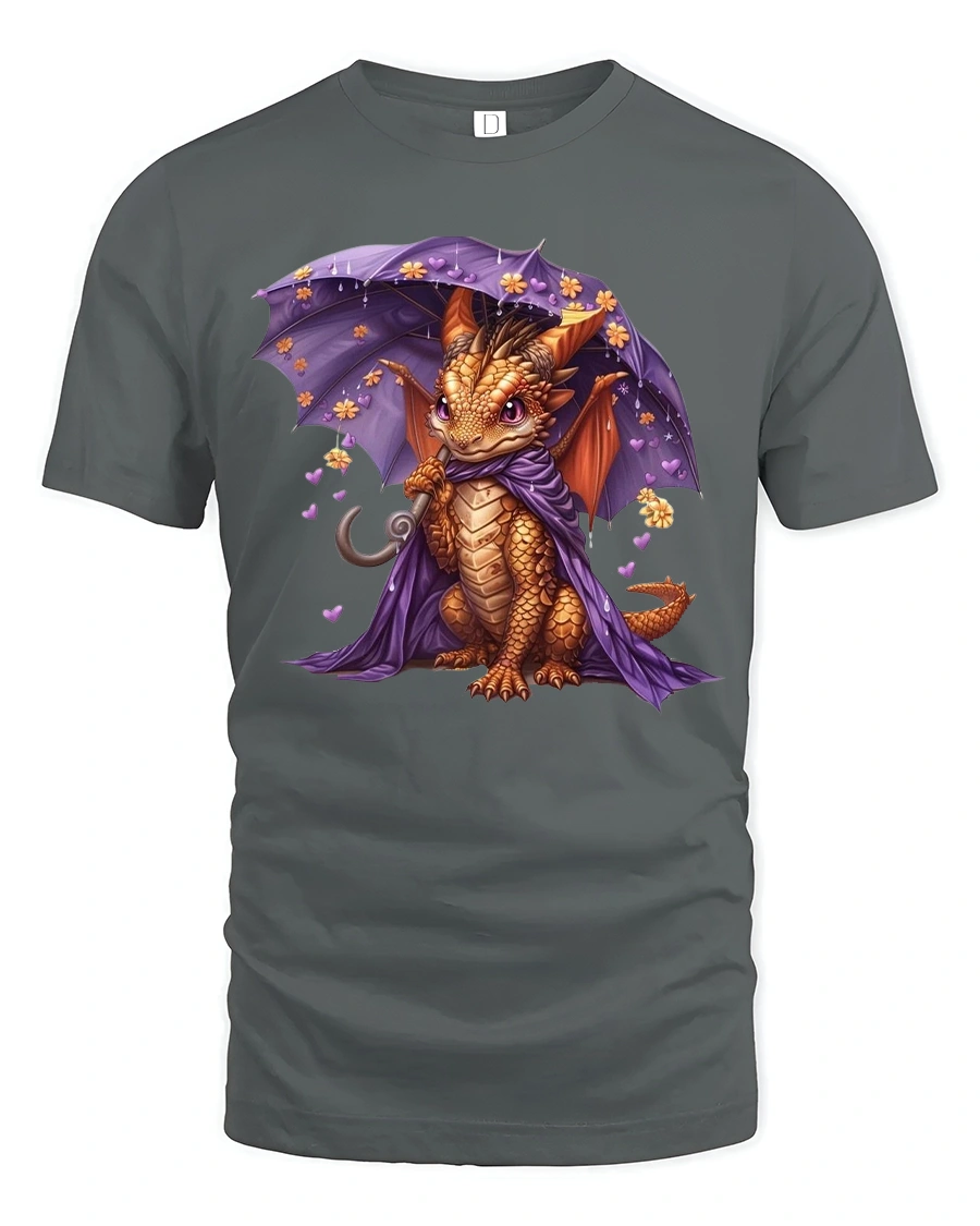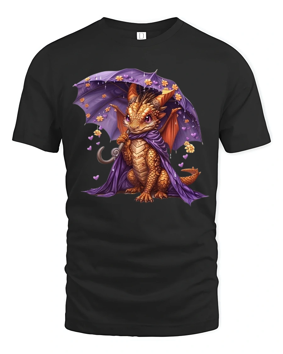 Cute Little Dragon with Purple Umbrella Art T-Shirt brings fantasy charm and cozy style together in one adorable design.