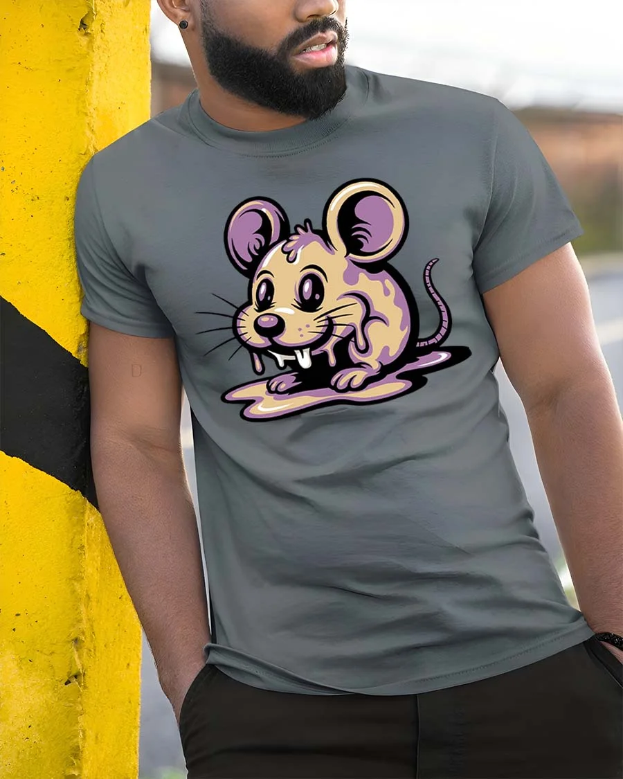 Cute Melting Mouse Graphic T Shirt Kawaii Drip Art Tee - model wearing grey tee, leaning on column