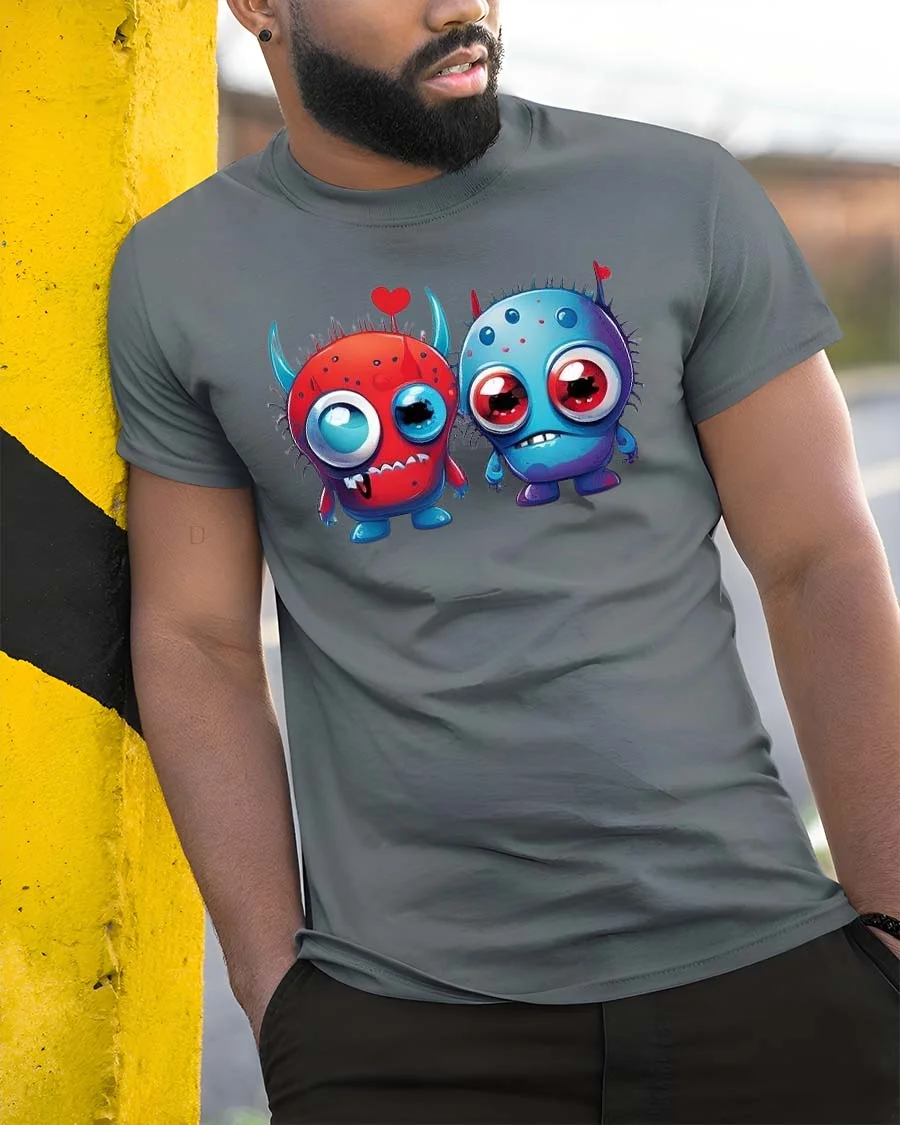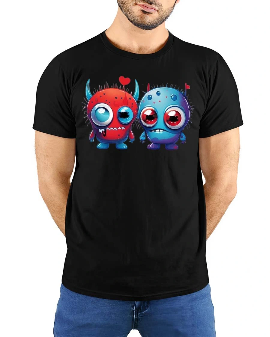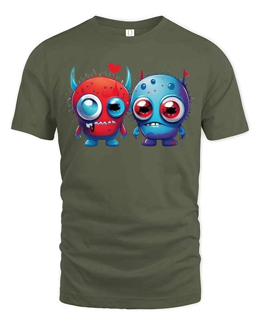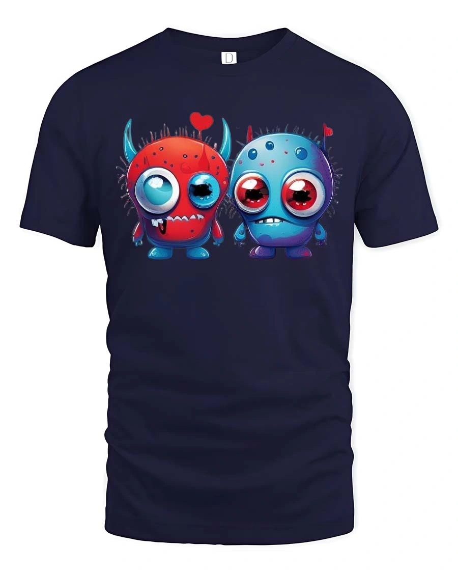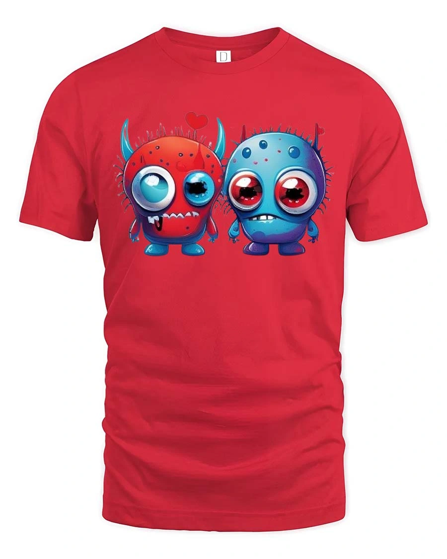 Cute Monster Love T Shirt Funny Cartoon Couple Art Style features an adorable pair of monster characters sharing a sweet and playful connection.