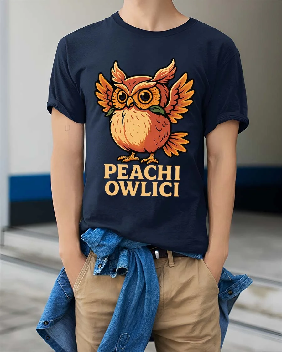Cute Peach Owl T Shirt Funny Owlici Cartoon Graphic Tee - model wearing navy tee with hands in pockets