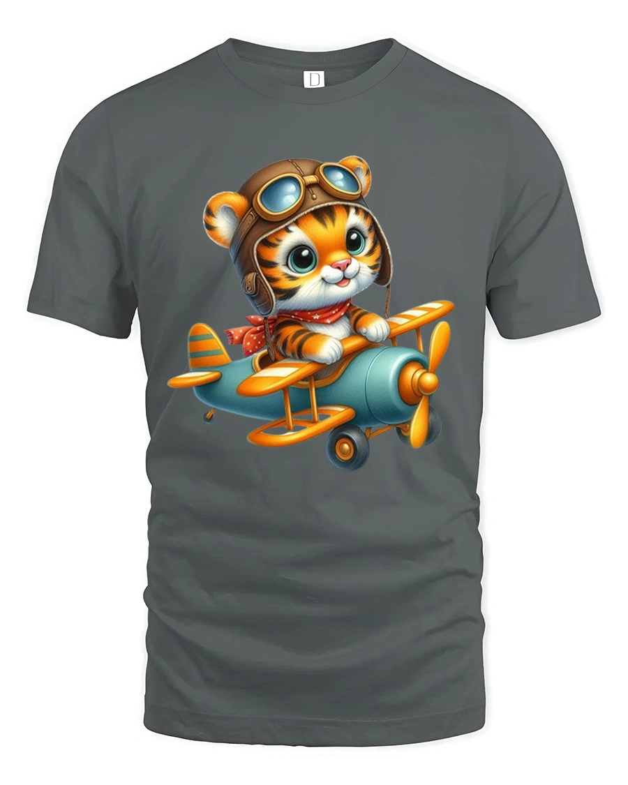 This graphic tee features an adorable tiger dressed as a pilot flying a small airplane with a cheerful and confident expression.