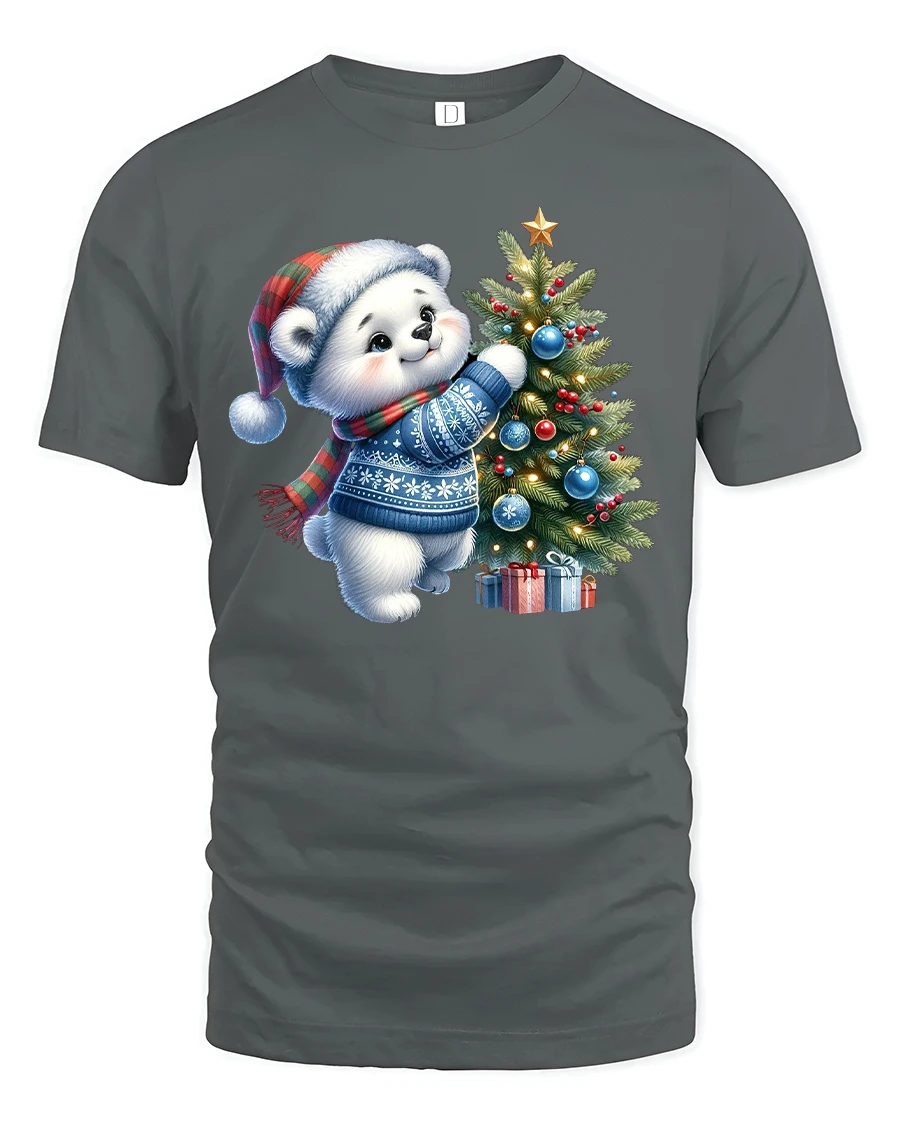 This Cute Polar Bear Christmas Tree Decorating Holiday Tee brings pure seasonal charm to your wardrobe with its heartwarming illustration. The design features an adorable polar bear in a cozy winter sweater and matching hat, carefully placing ornaments on a beautifully lit Christmas tree. Bright baubles, festive lights, and wrapped presents add even more magic to the scene, capturing the joyful spirit of the holidays in a soft and welcoming style.
