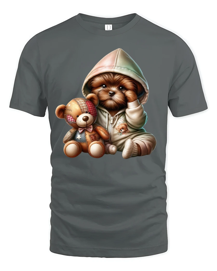 Featuring a sweet little puppy in a pastel hoodie cuddling a teddy bear, this tee captures the soft, cozy side of life that every animal lover will adore.