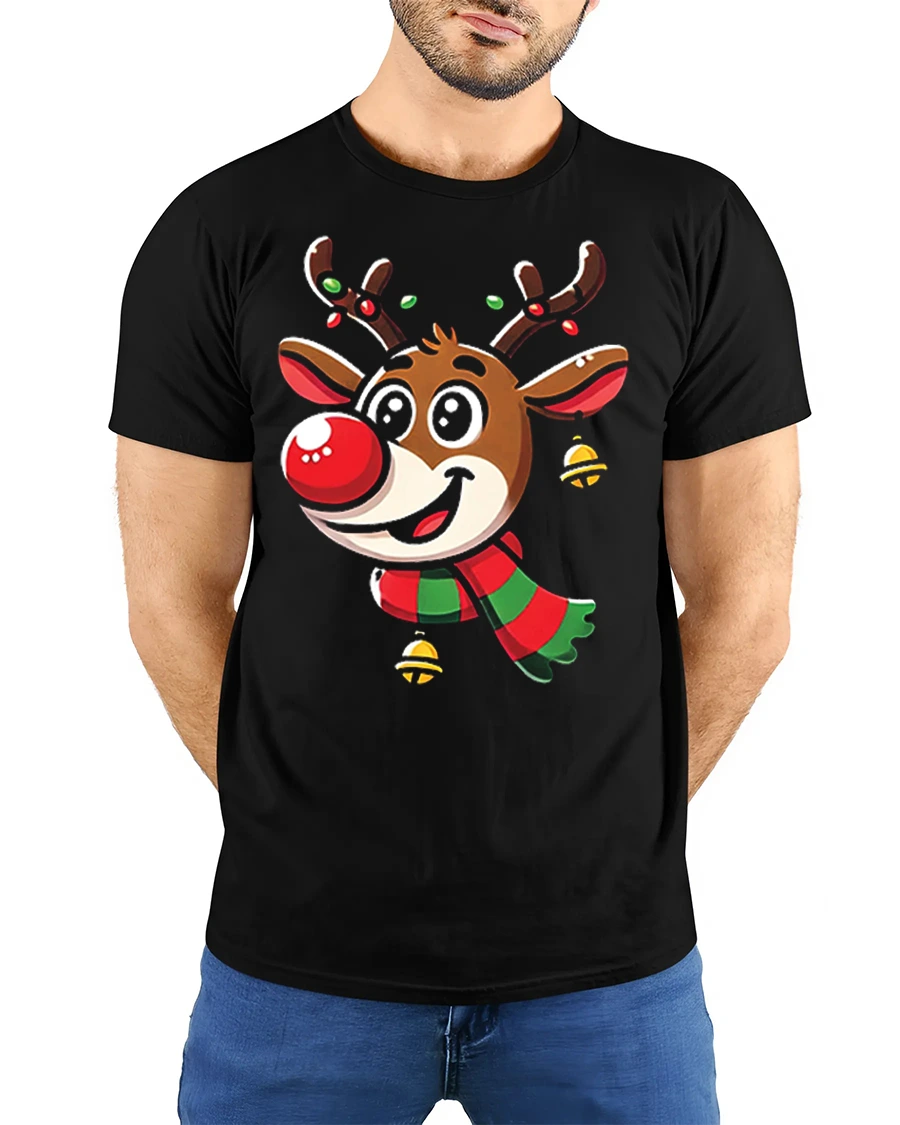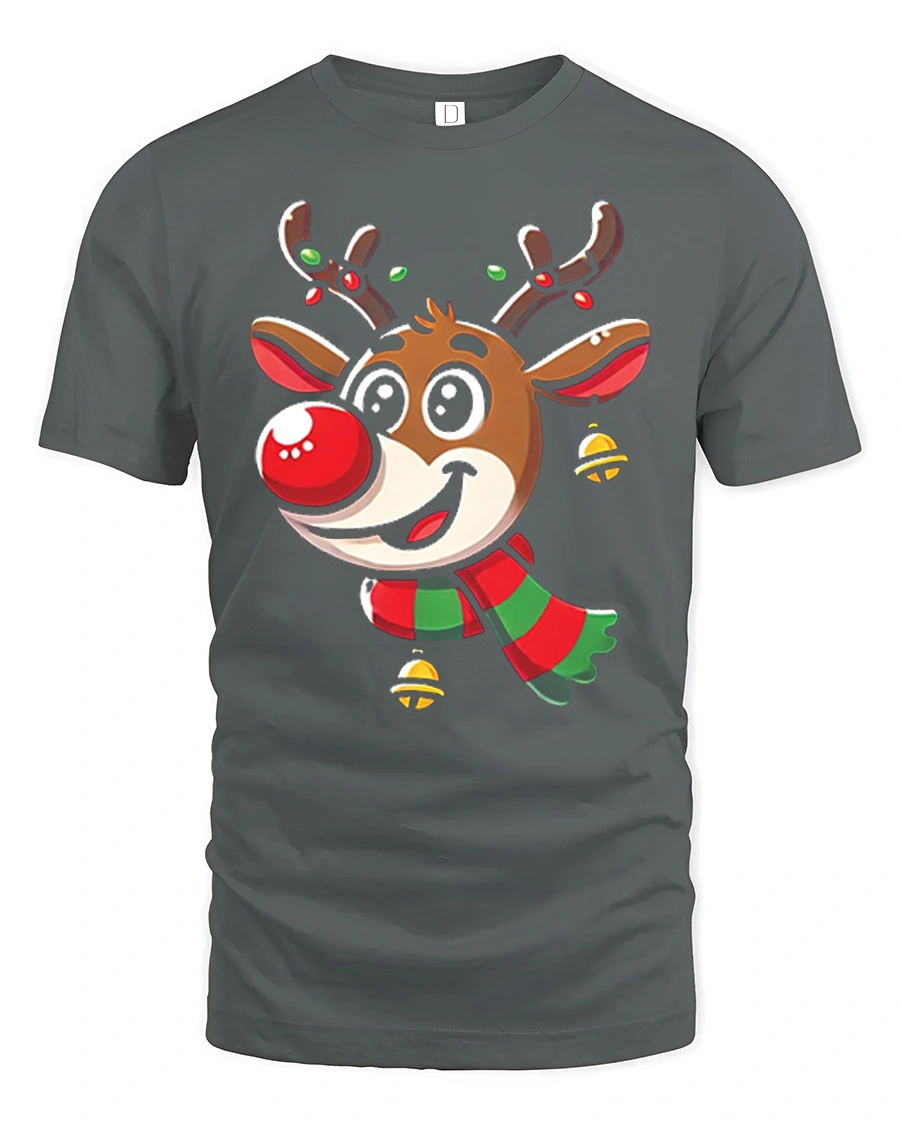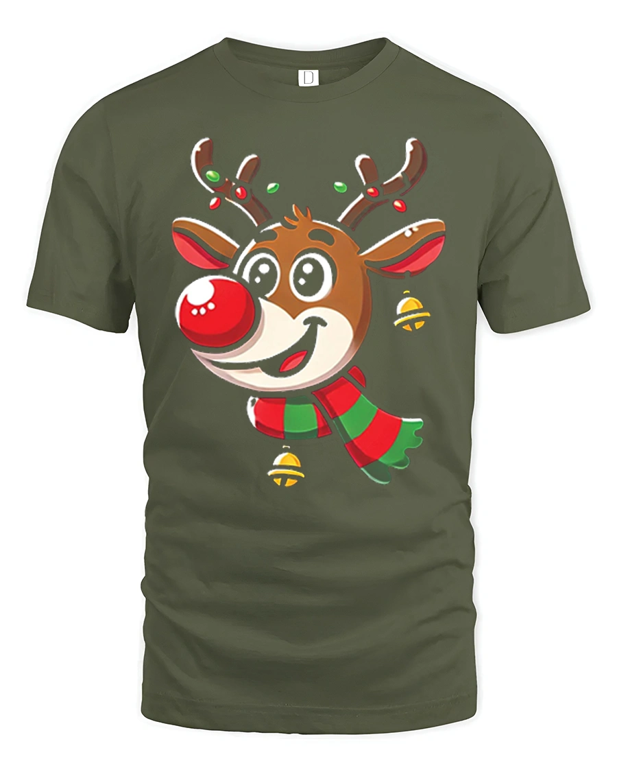 This Cute Reindeer Christmas Tee with Festive Scarf and Jingle Bells brings cheerful holiday spirit to your wardrobe with its bright and joyful character design. The smiling reindeer features a shiny red nose, expressive cartoon eyes, and a colorful striped scarf that adds extra warmth and charm. Small jingle bells and festive accents around the antlers complete the playful Christmas look, making the tee a fun favorite throughout the season.