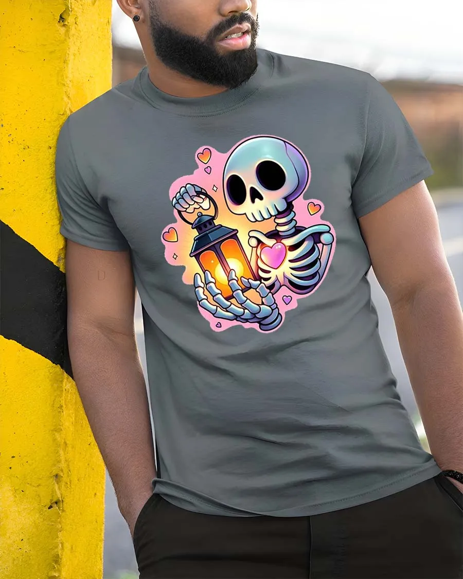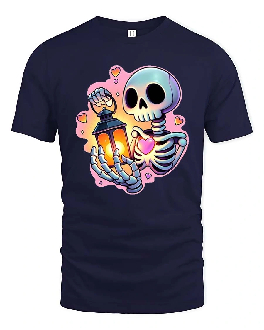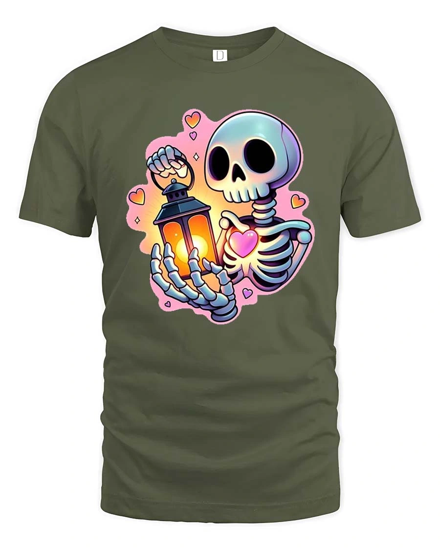 The Cute Skeleton Holding Lantern and Heart Cartoon Graphic Tee stands out with vibrant colors, smooth cartoon style lines, and a warm glowing lantern that adds a cozy visual touch.