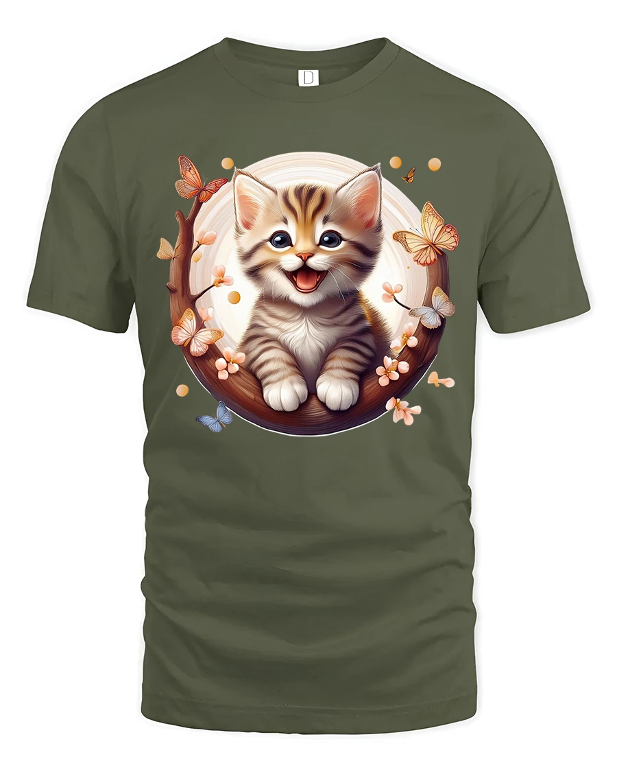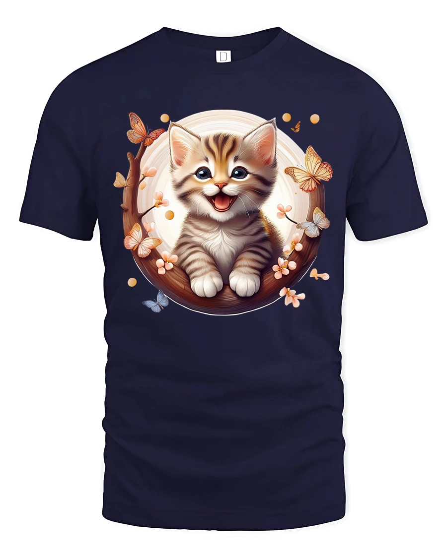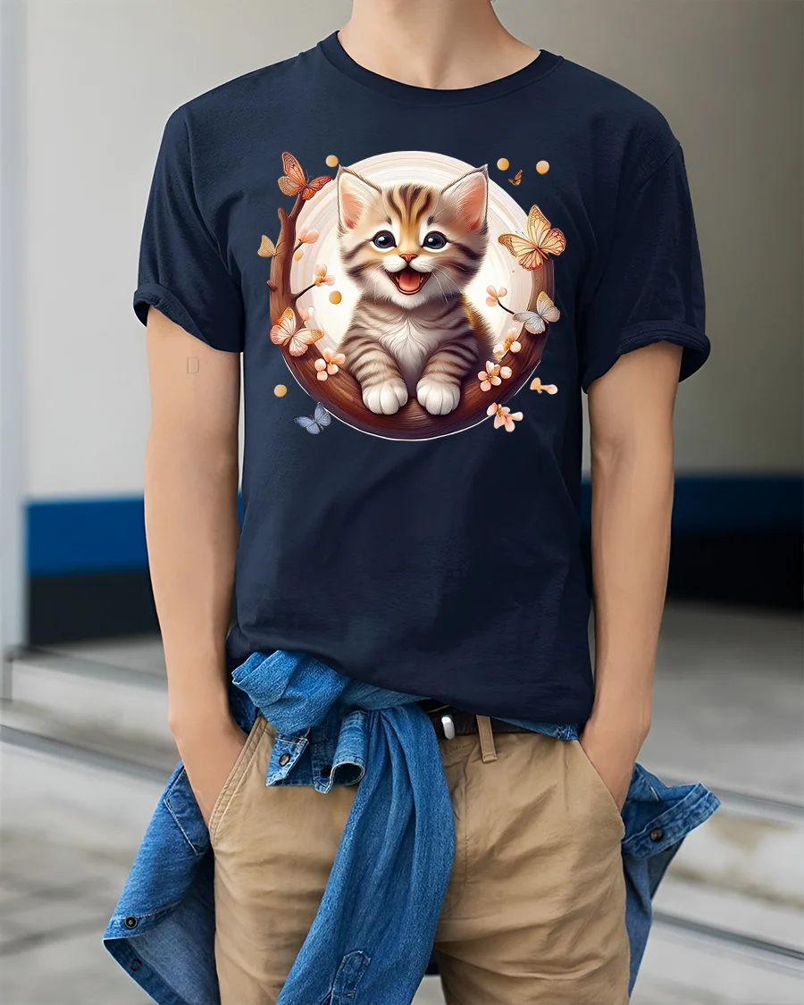 The vibrant, high-quality print captures every detail—from the kitten’s bright eyes to the fluttering butterflies—making it a standout piece in your casual wardrobe.
