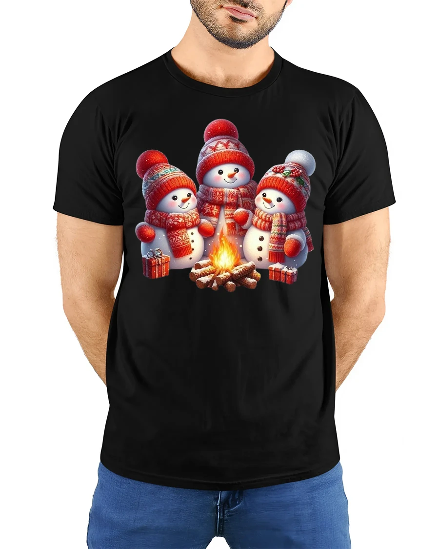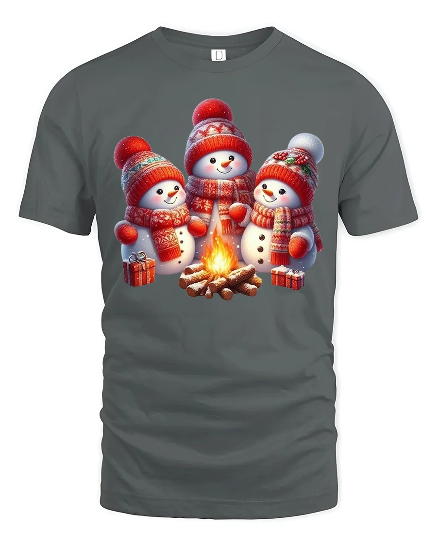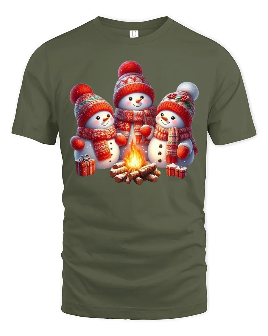 The design features three adorable snowmen dressed in cozy winter hats and scarves gathered around a glowing campfire with festive presents nearby. The soft colors, cheerful expressions, and heartwarming atmosphere make this tshirt ideal for holiday parties, family events, winter outings, or simply embracing the seasonal spirit.