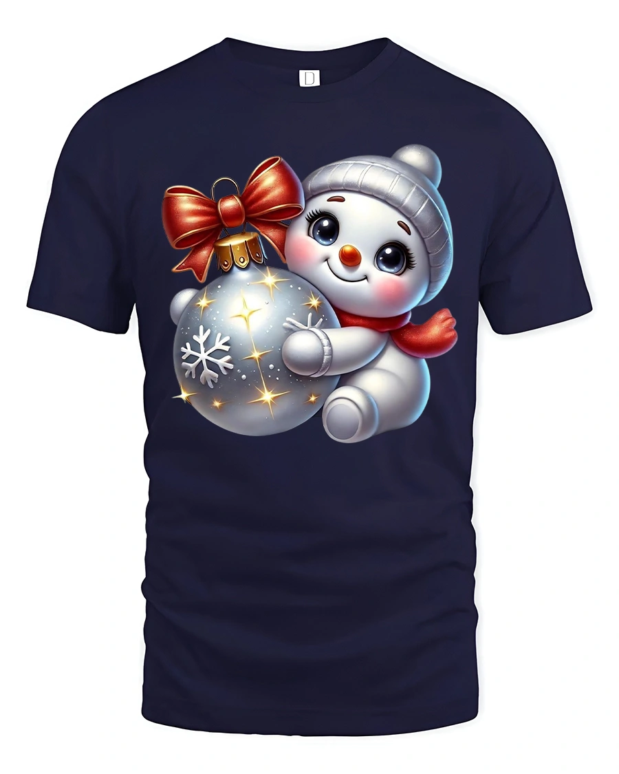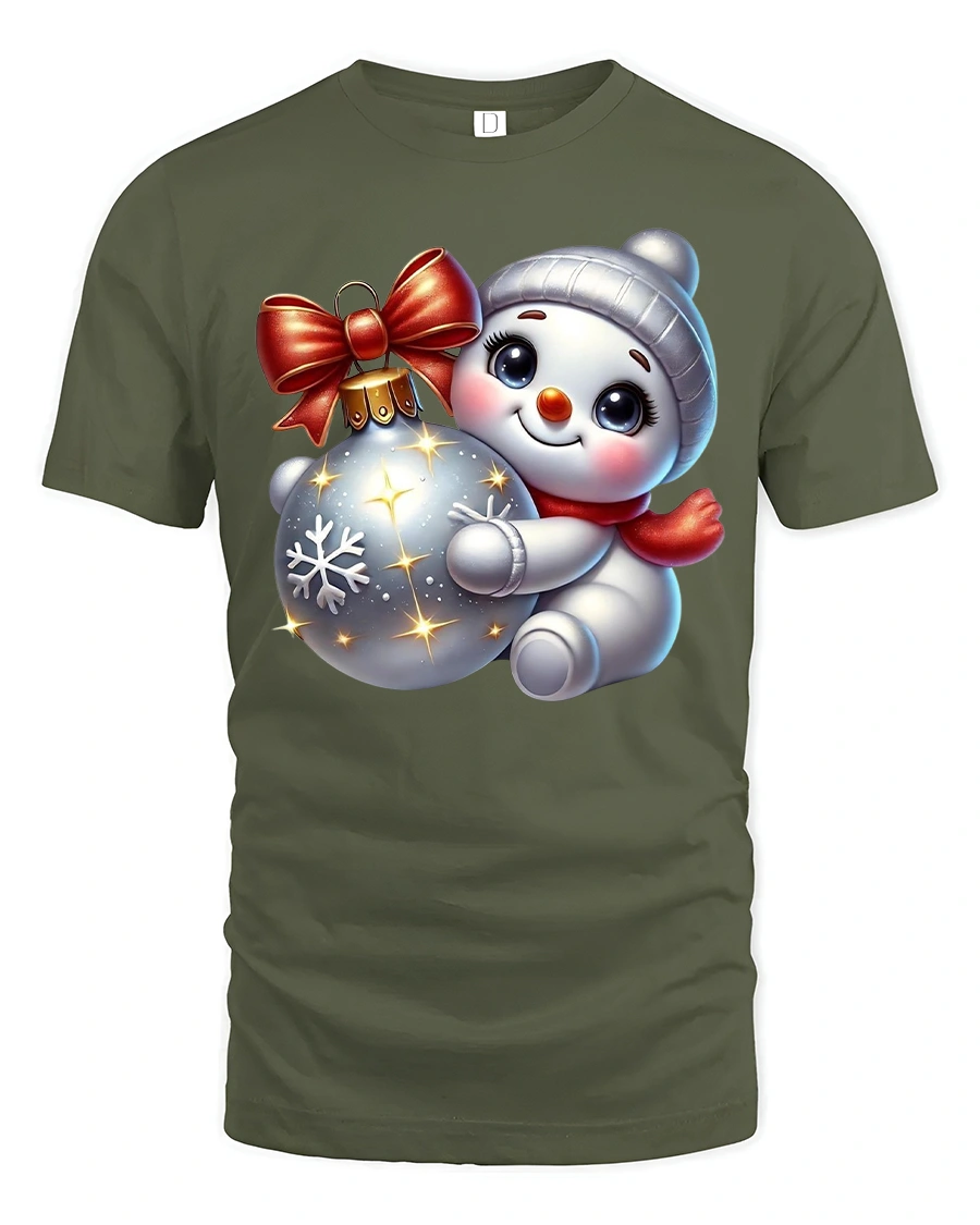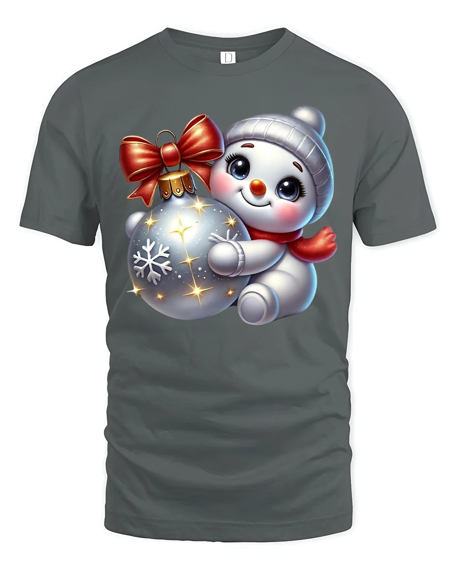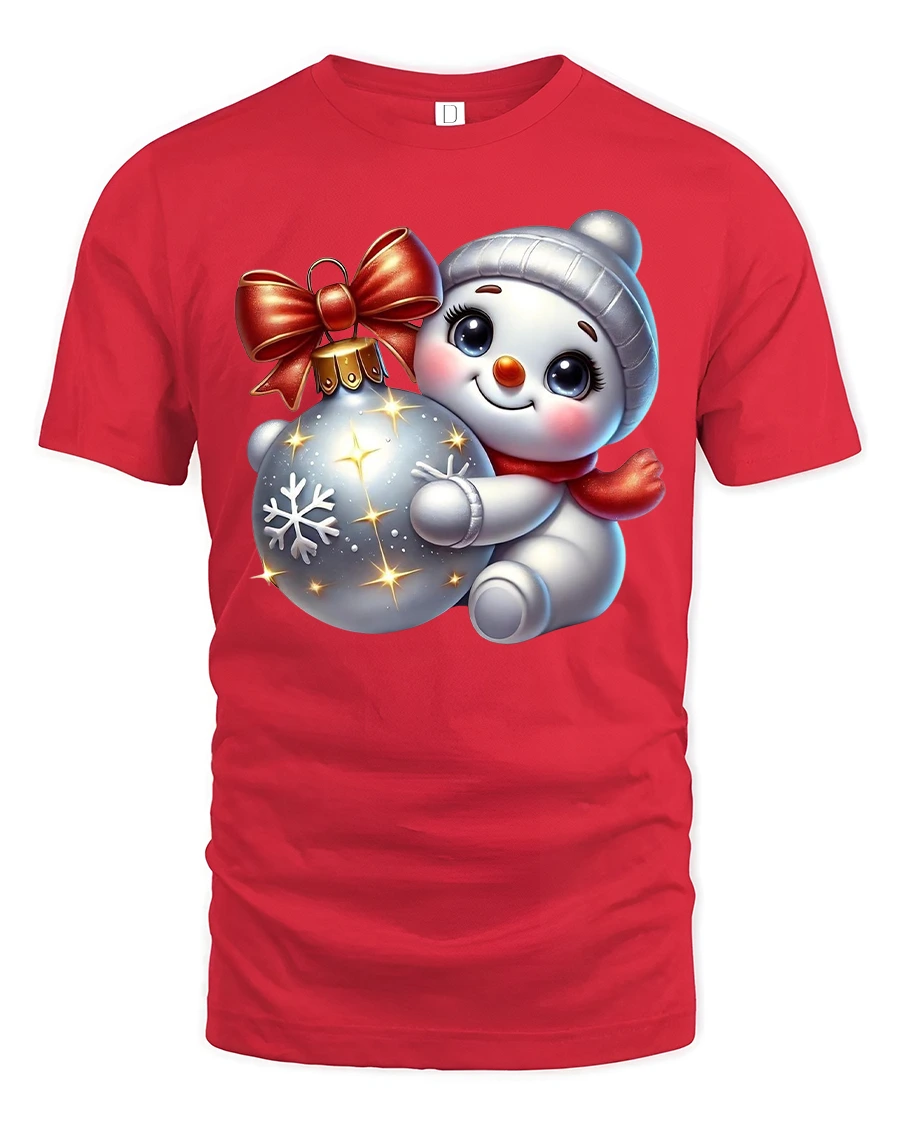Cute Snowman Hugging Ornament Christmas Holiday Graphic Tee brings pure holiday joy to your wardrobe with its heartwarming and festive artwork. Featuring an adorable snowman wearing a cozy winter hat and scarf, holding a sparkling ornament decorated with snowflakes and a big shiny bow, this tee is designed to make anyone smile. The charming expression and bright Christmas colors capture the magic and warmth of the season perfectly.