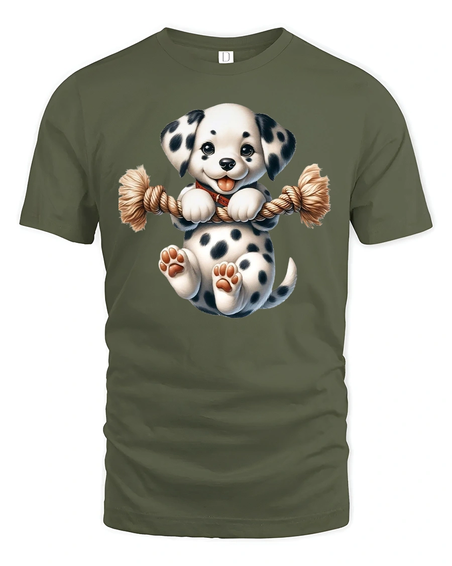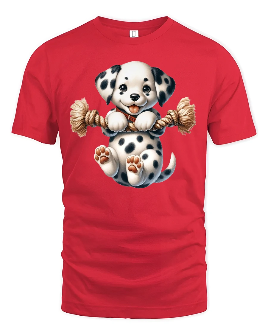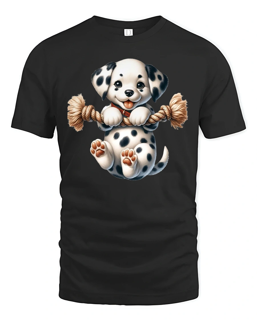 This Cute Spotted Puppy Tug Rope Graphic Tee Fun Playful T-Shirt brings irresistible charm to any outfit with its adorable cartoon design. Featuring a happy spotted puppy hanging onto a tug rope with bright eyes and playful energy, this tee is perfect for kids, dog lovers, and anyone who enjoys cute and uplifting animal artwork. The cheerful expression and detailed illustration make the design stand out with personality and fun.