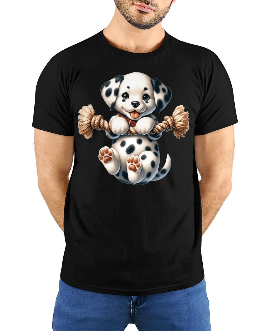 Whether you’re searching for a unique gift, a fun wardrobe addition, or a playful graphic for pet lovers, this spotted puppy tug rope shirt is an excellent choice. Bring joy, cuteness, and a touch of puppy mischief to your style with this adorable cartoon dog t-shirt.