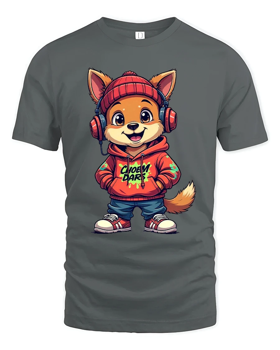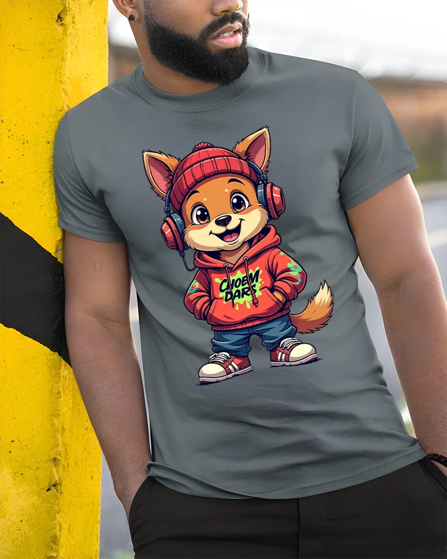 The Cute Street Style Dog With Hoodie And Headphones Graphic T Shirt is crafted with a soft comfortable fabric feel suitable for everyday wear.