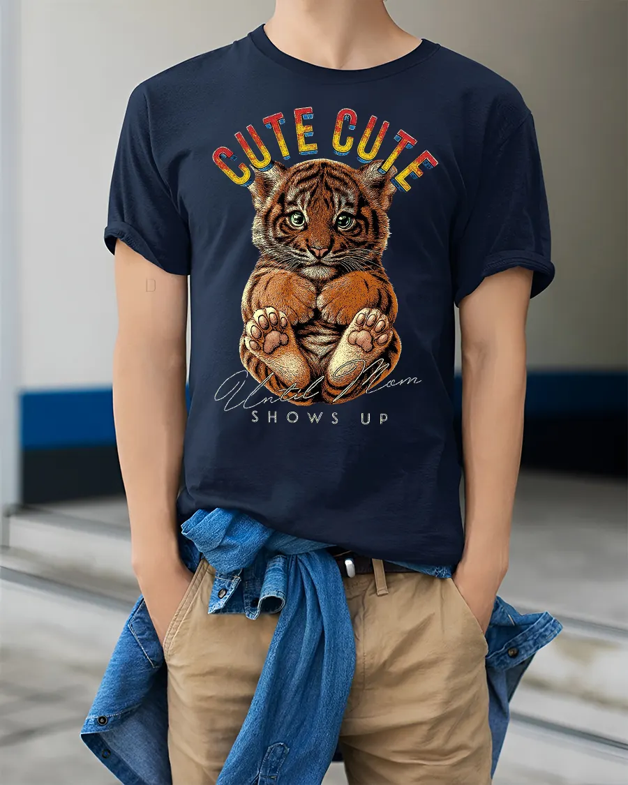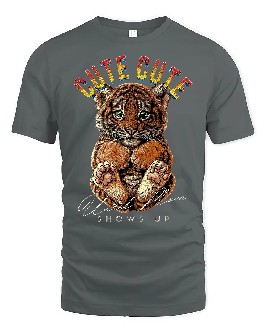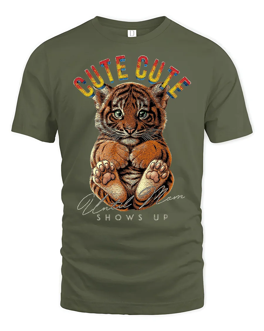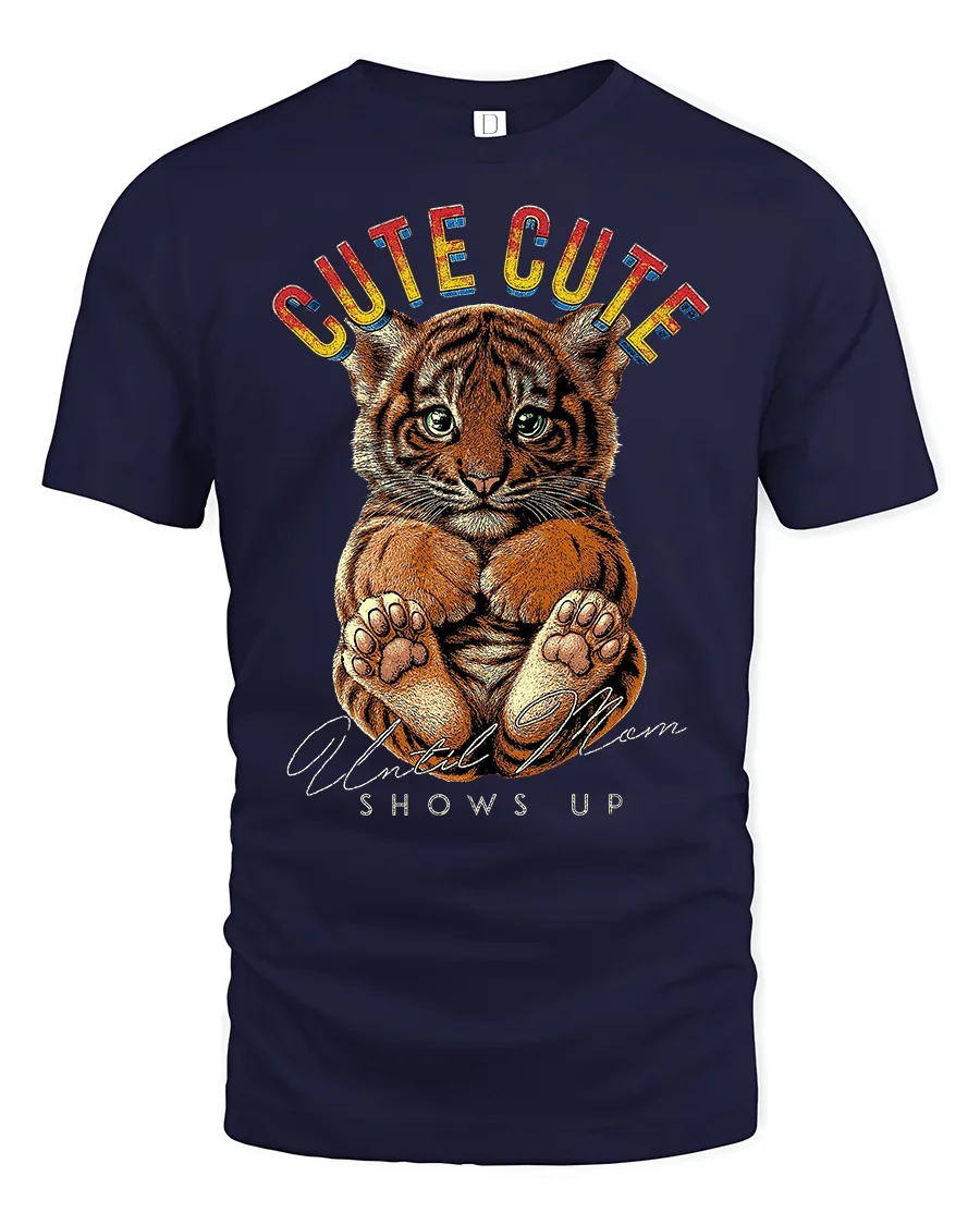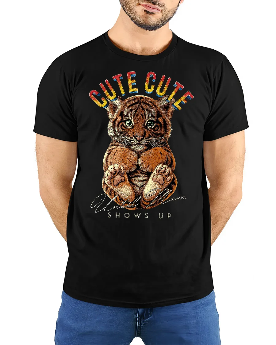 Cute Tiger Cub Mom Warning Graphic T-Shirt Tee brings irresistible charm together with playful humor, making it a perfect choice for animal lovers of all ages. This adorable design features a sweet baby tiger sitting with big expressive eyes, paired with the funny phrase “Cute Cute Until Mom Shows Up,” creating a blend of cuteness and attitude that appeals to both kids and adults.