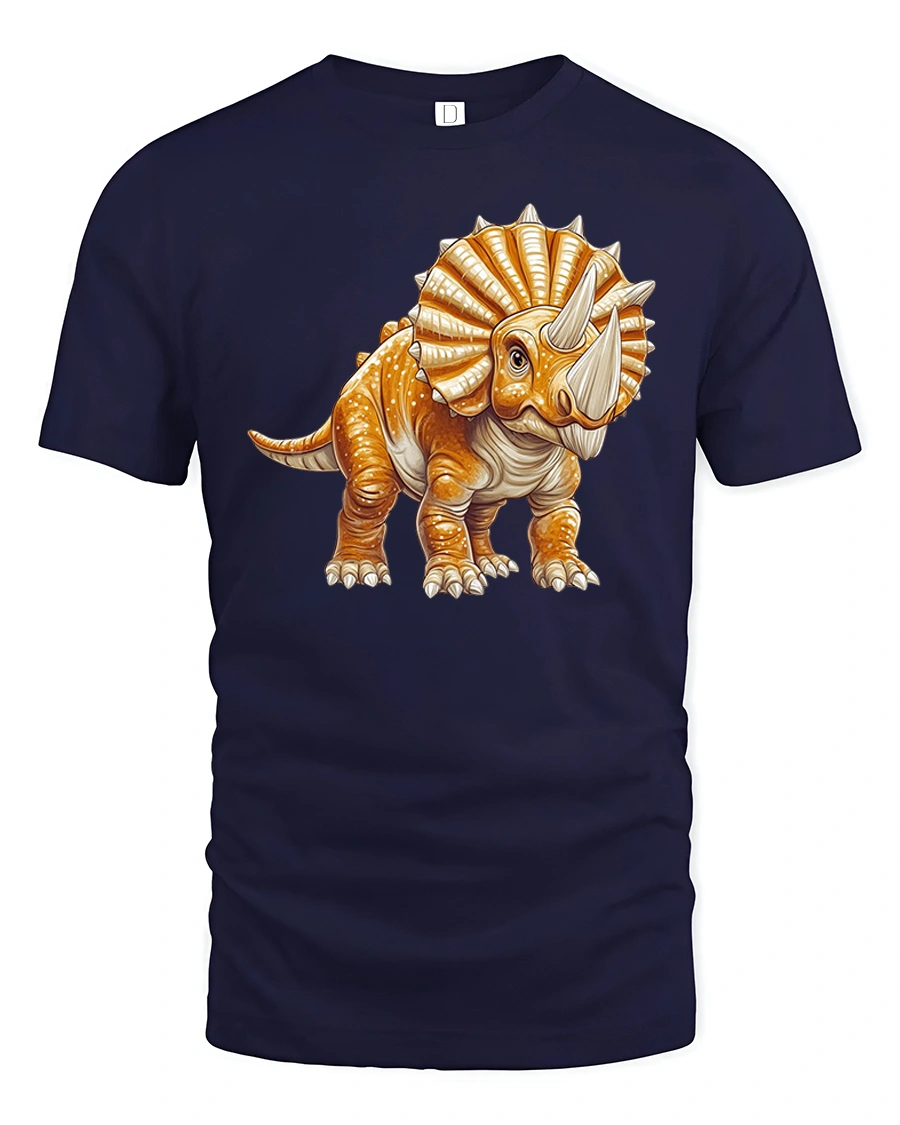 This design features a friendly triceratops with soft details and a warm color palette that feels cute and approachable.