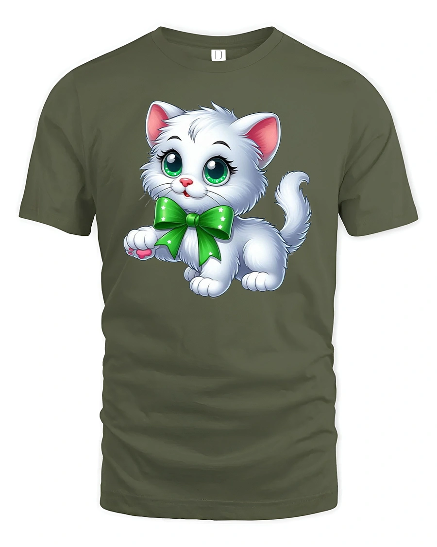 Cute White Kitten T-Shirt – Adorable Green Bow Design is the perfect tee for cat lovers who can’t resist a touch of cuteness.