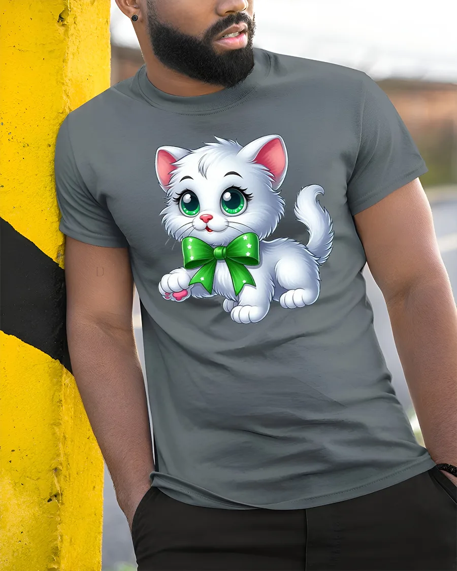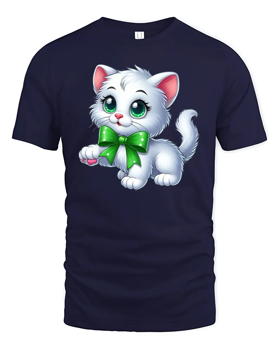 Express your love for furry friends with the Cute White Kitten T-Shirt – Adorable Green Bow Design.