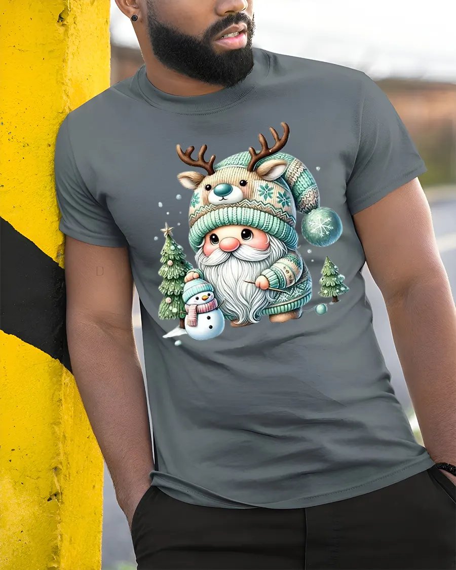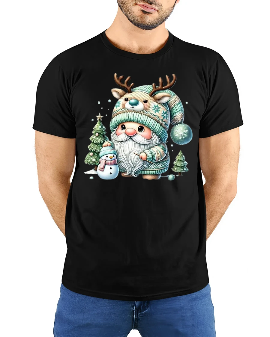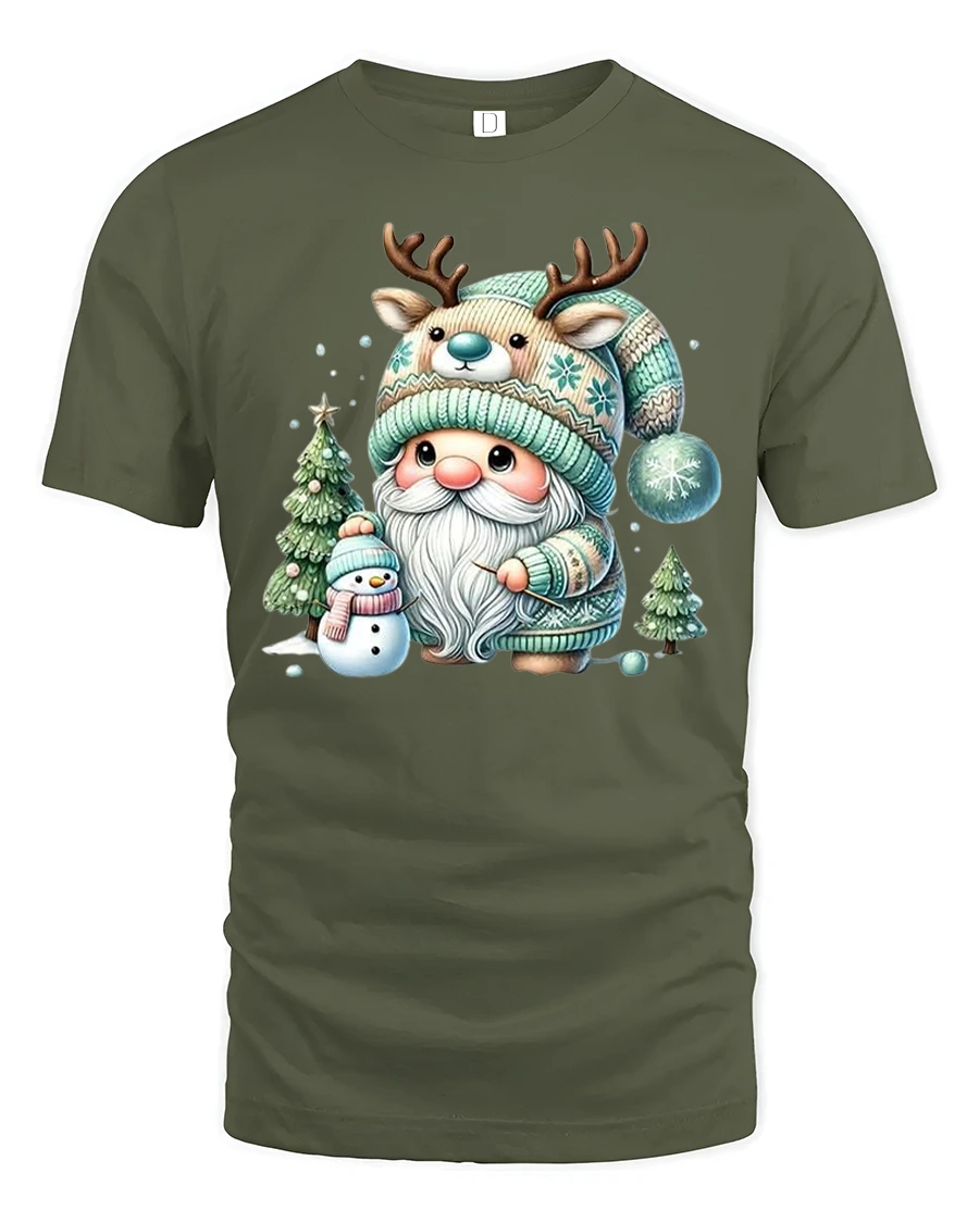 Featuring an adorable gnome dressed in a reindeer themed hat and winter sweater, surrounded by snowflakes, small trees, and a friendly snowman, this tshirt captures the magic of snowy days and Christmas fun. The soft colors and detailed illustration make it ideal for holiday parties, family gatherings, school events, or simply enjoying the wintertime spirit.