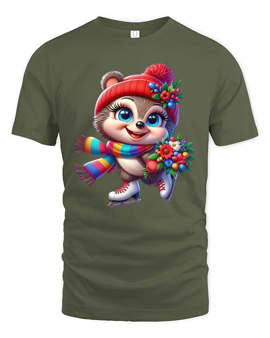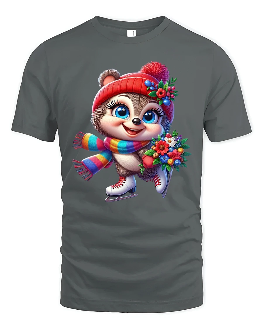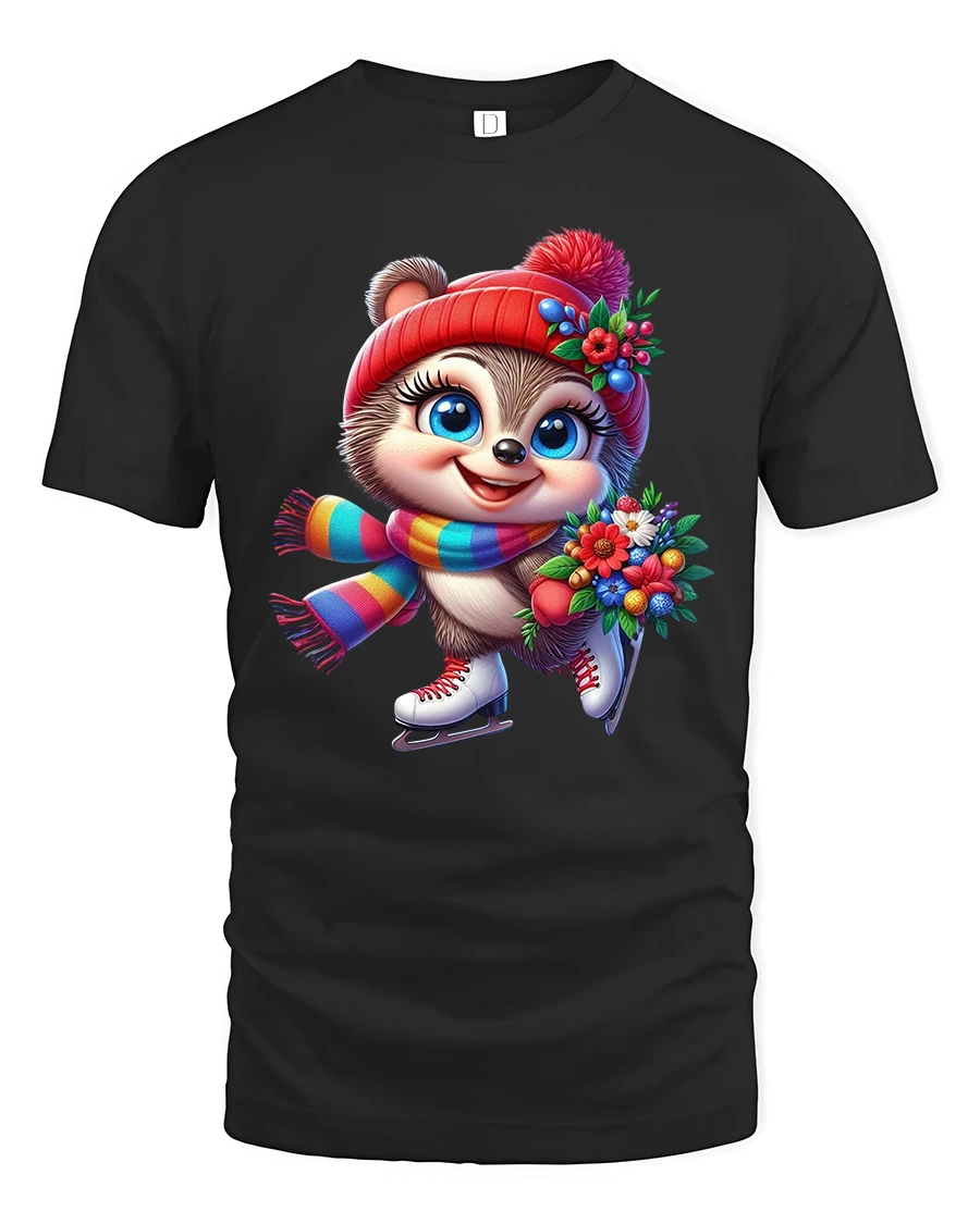 This Cute Winter Skater Critter Tee with Flowers and Colorful Scarf brings joyful seasonal charm to every outfit. Featuring an adorable wide-eyed animal wearing ice skates, a bright rainbow-striped scarf, and a cozy red winter hat decorated with festive flowers, this tee captures the magic and excitement of winter fun. The character’s happy expression and the vibrant bouquet add a heartwarming touch that makes the design truly stand out.