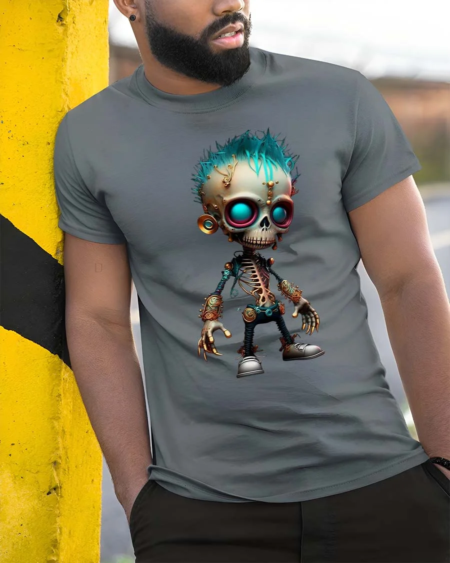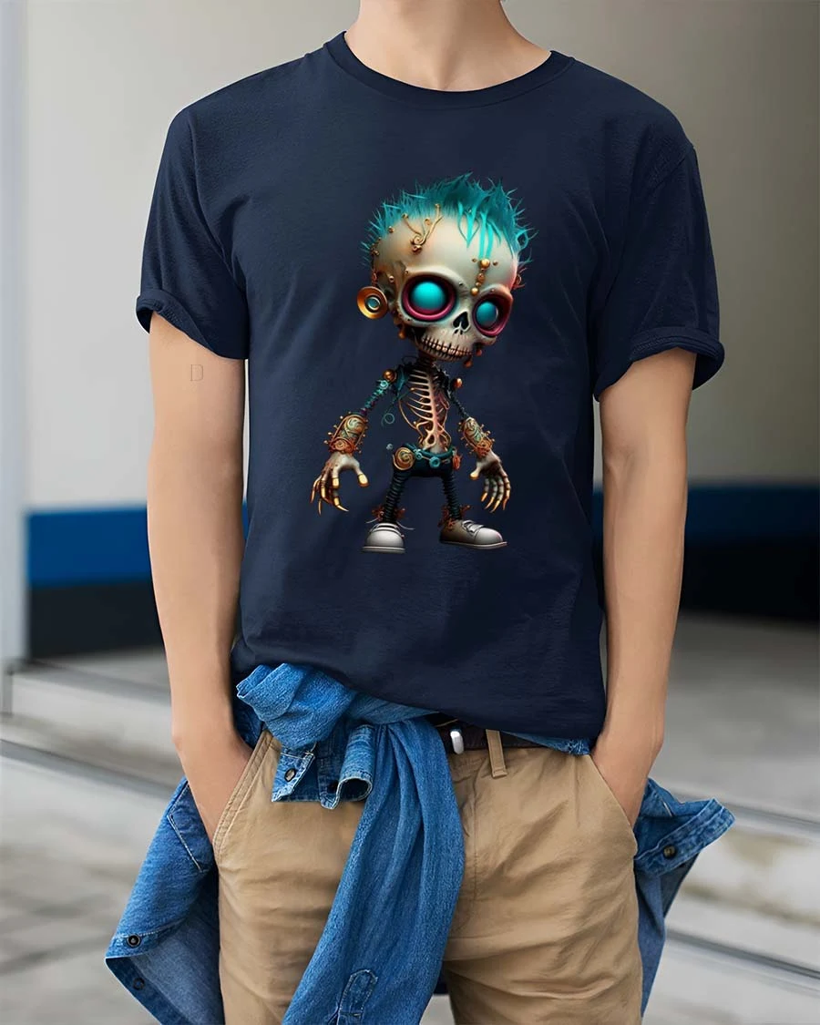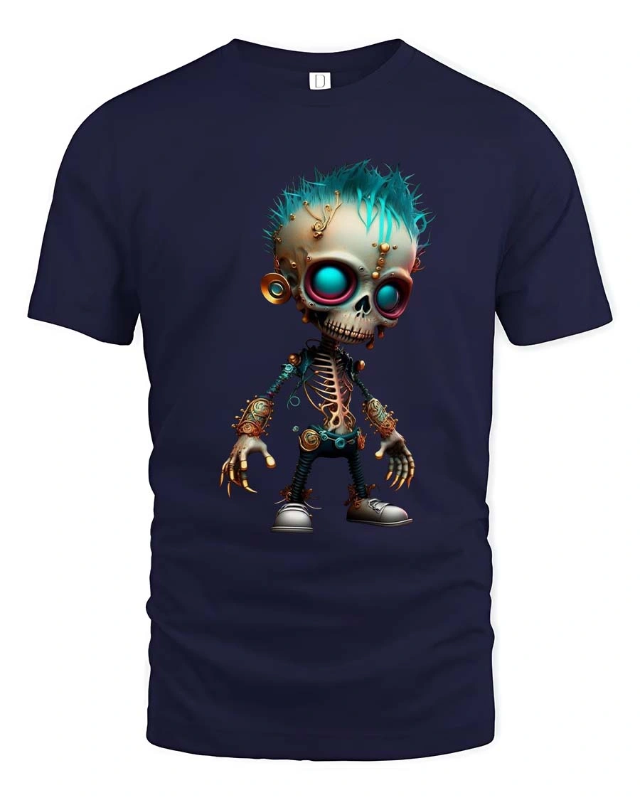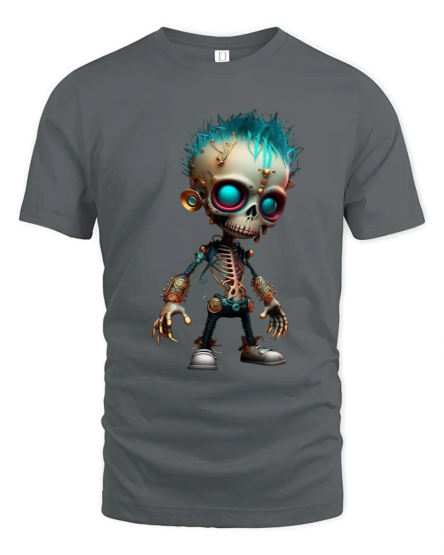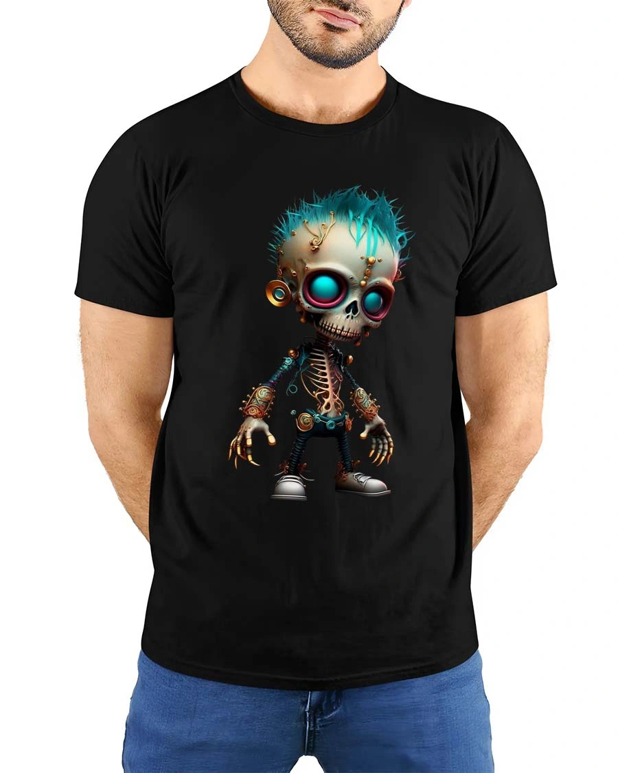 Add bold personality to your wardrobe with this Cyber Punk Skull T Shirt featuring a quirky big eye skeleton character with neon blue hair and intricate steampunk details. The playful yet edgy design blends gothic vibes with futuristic art, creating a cyber punk skull t shirt that stands out with attitude and creativity. Every detail from the metallic accents to the glowing eyes gives this graphic a dynamic and eye catching appeal.