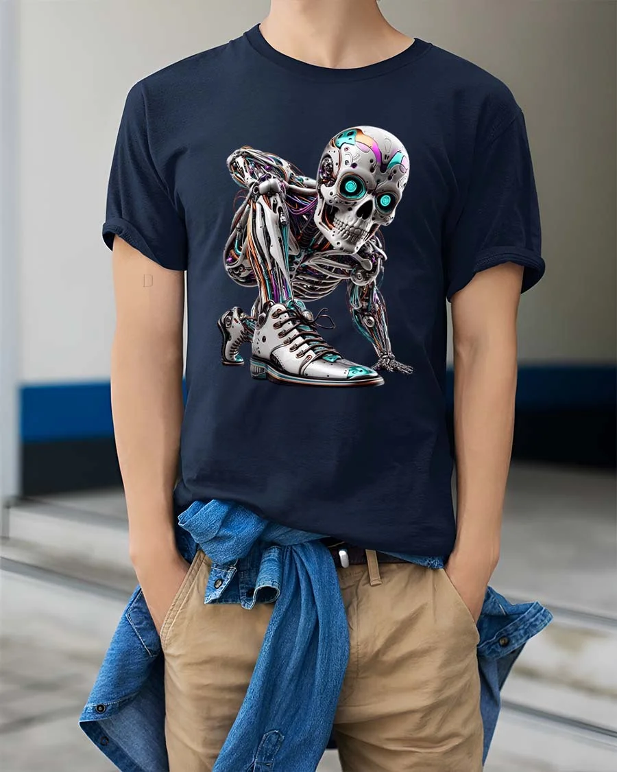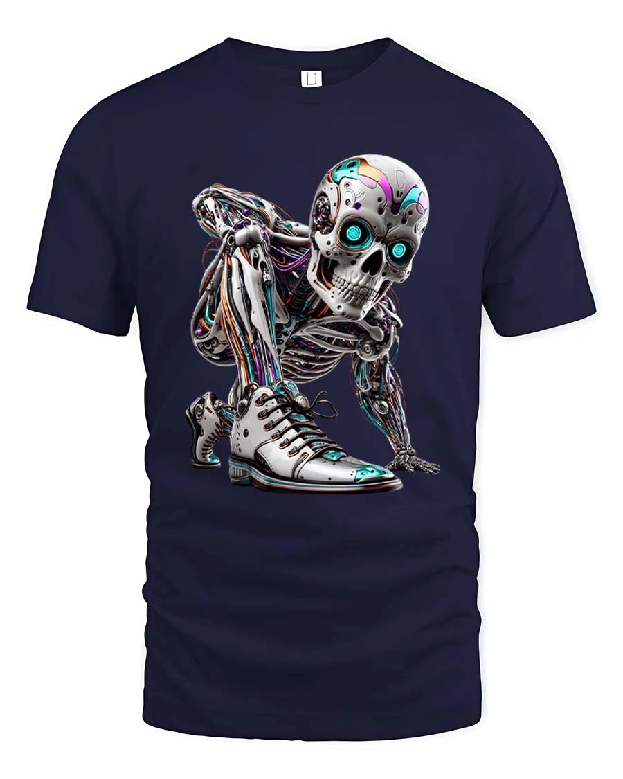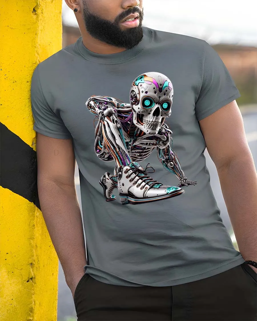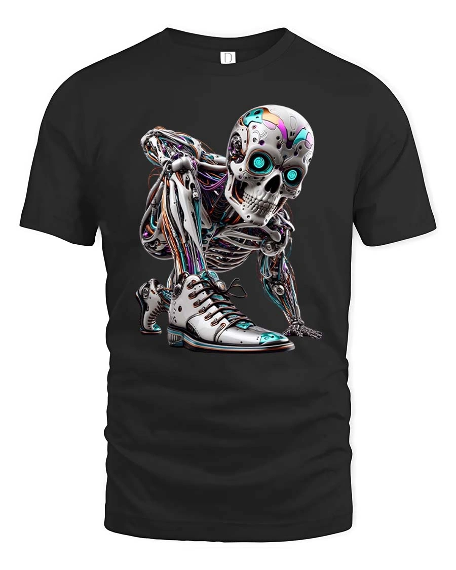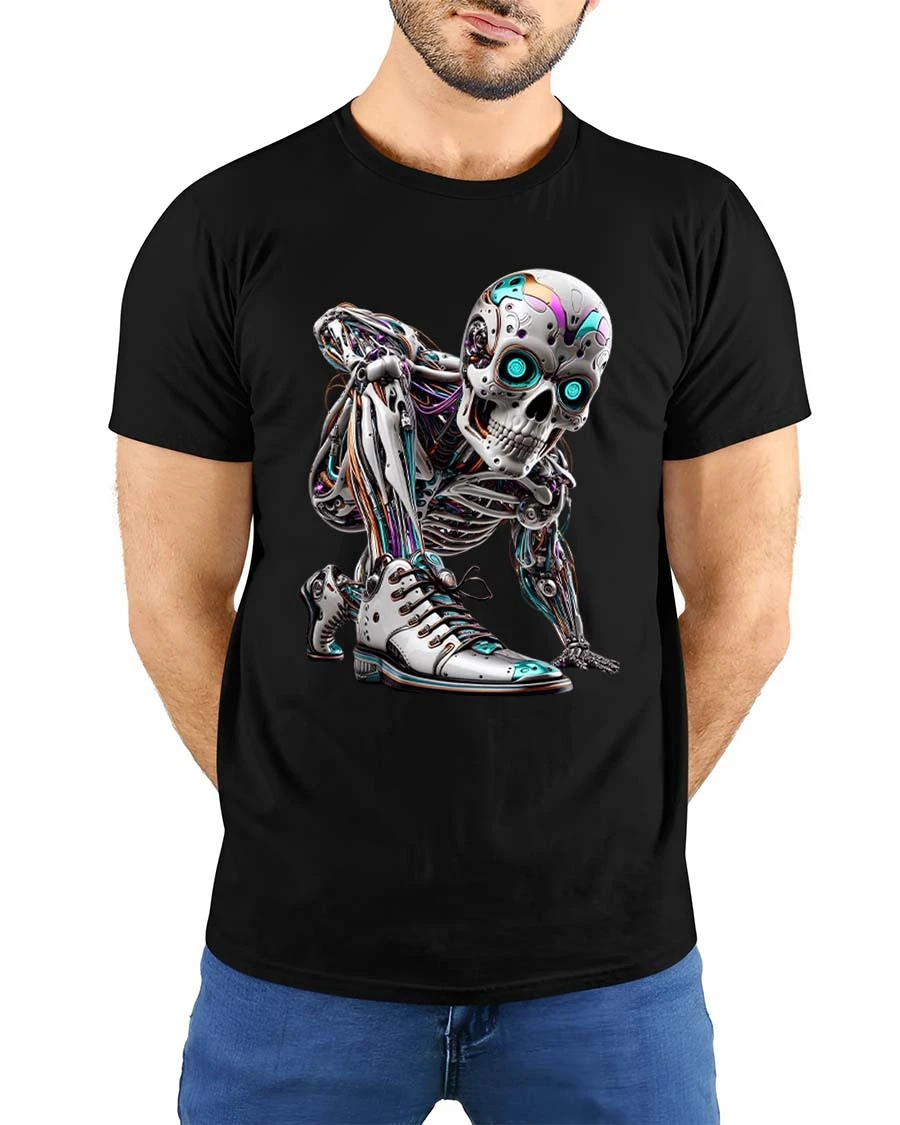 Featuring a highly detailed cyborg skeleton with glowing neon eyes and intricate mechanical elements, this graphic tee captures the essence of futuristic fashion and modern edge.