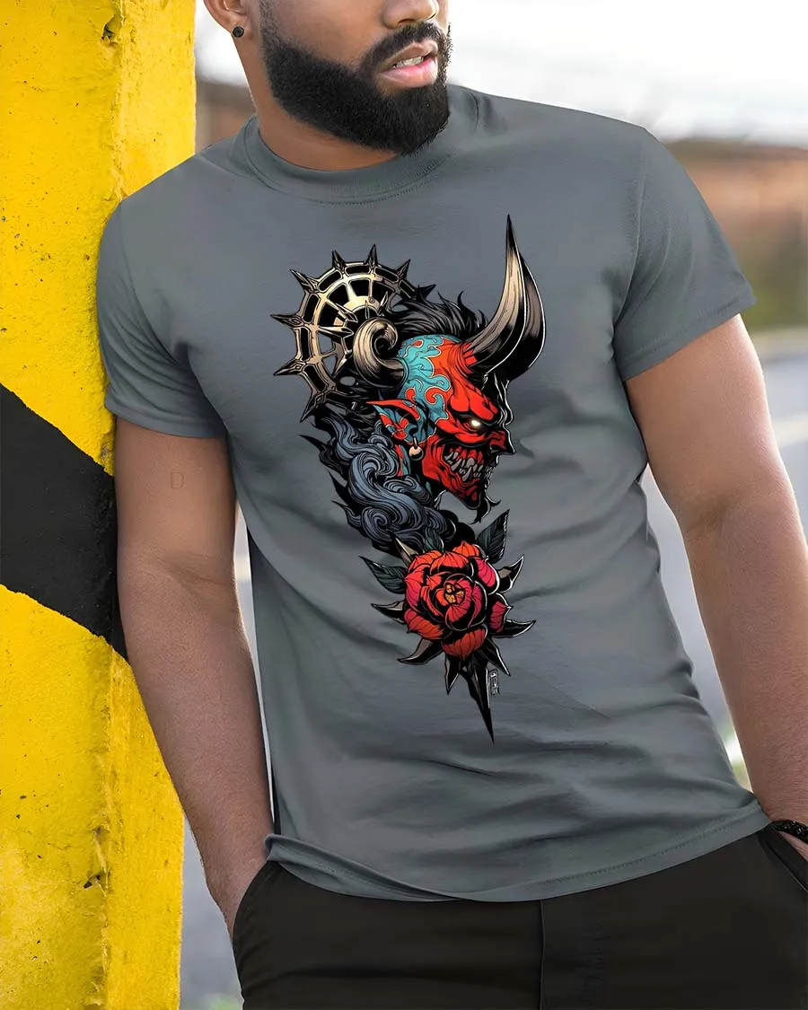 Cyberpunk Robotic Hand Rose Graphic T Shirt Tech Art Tee - model wearing grey tee, leaning on column