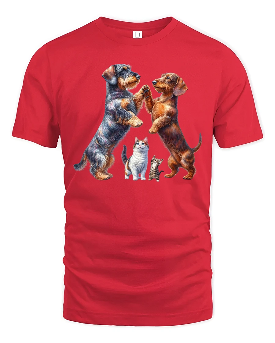 Dancing Dogs and Cats Funny T-shirt - red t-shirt on white background