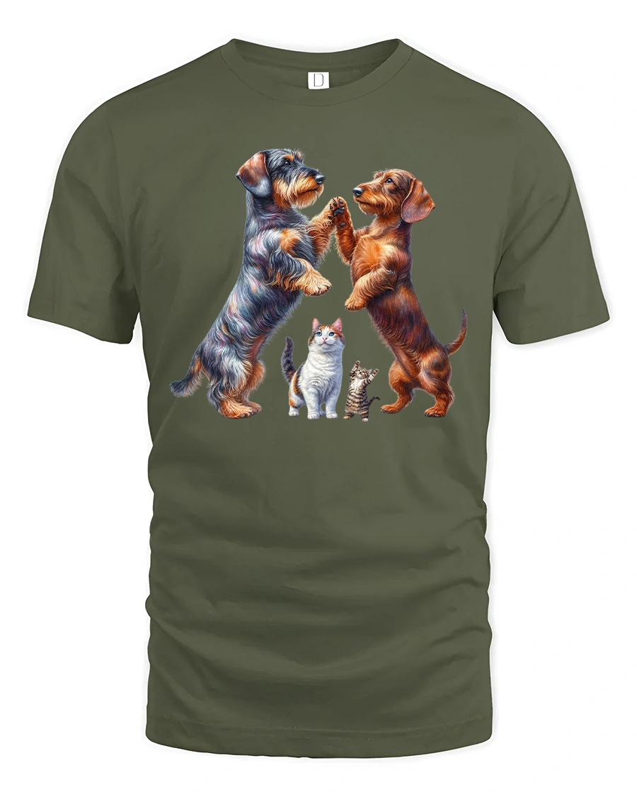 Dancing Dogs and Cats Funny T-shirt - military green t-shirt on white background