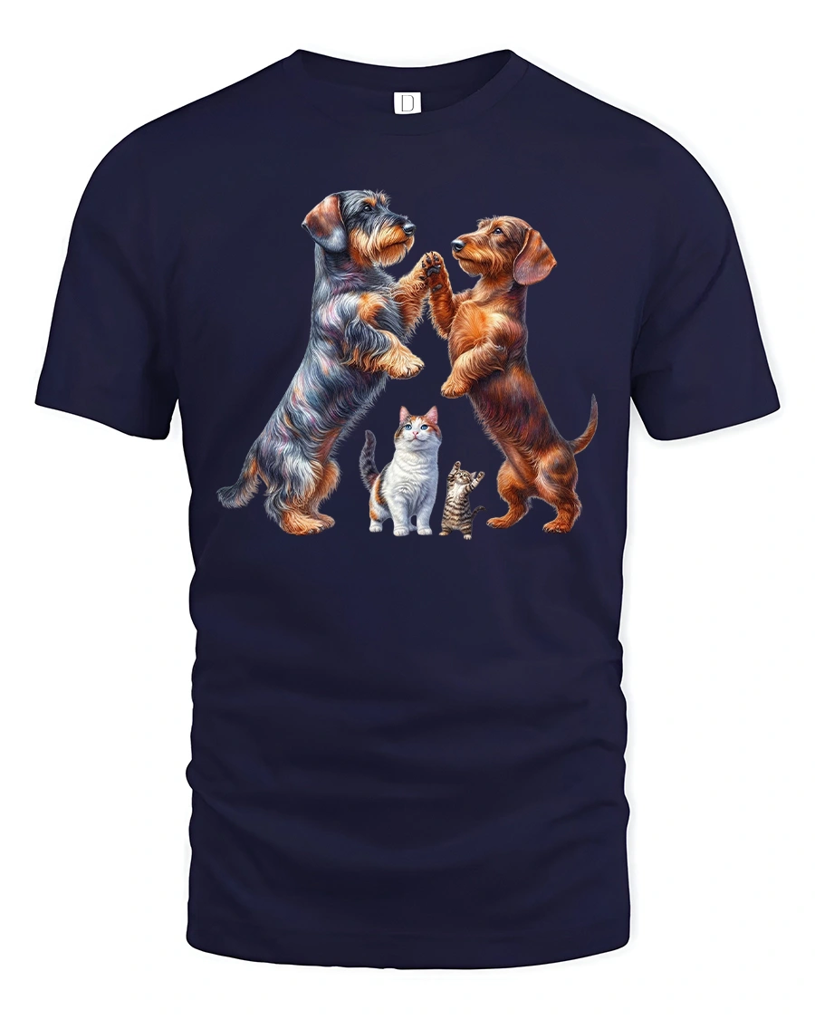 Dancing Dogs and Cats Funny T-shirt - navy t-shirt on white background