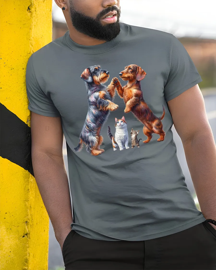 Celebrate the joy of pets with the Dancing Dogs and Cats Funny Graphic T-Shirt for Pet Lovers. Featuring two adorable dogs standing on their hind legs dancing, while two cute cats watch below, this design captures the playful and heartwarming spirit of our furry friends. It’s a perfect tee for anyone who loves both dogs and cats.