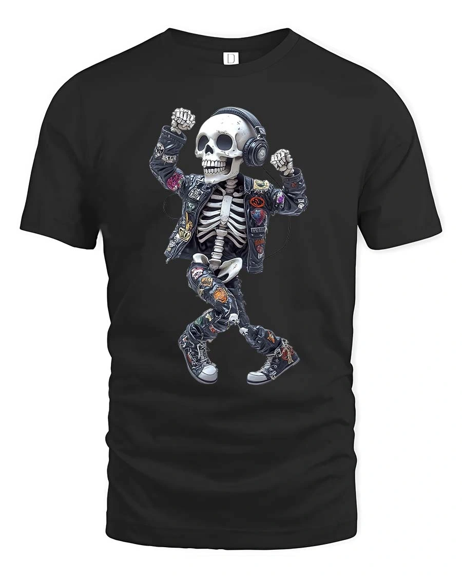 This Dancing Skeleton DJ Graphic T Shirt Headphones Street Art blends music culture street fashion and bold graphic illustration.