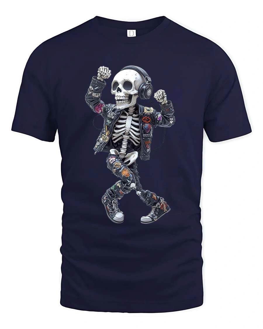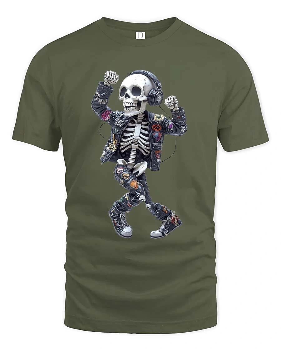 Dancing Skeleton DJ Graphic T Shirt Headphones Street Art features a lively skeleton character enjoying music with energetic style.