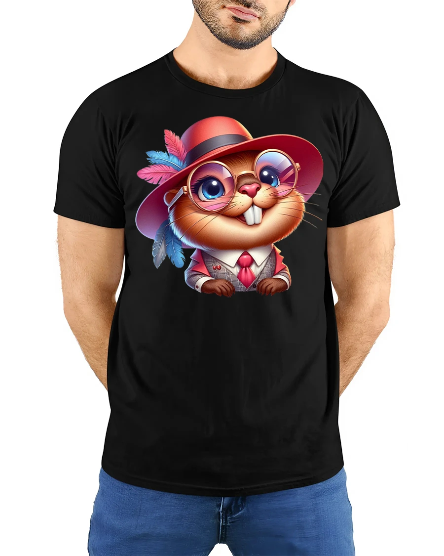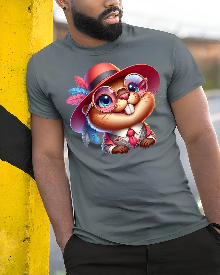 Featuring a cheerful beaver in a red suit, pink tie, glasses, and a feathered hat, this design adds a playful yet classy touch to any casual look.