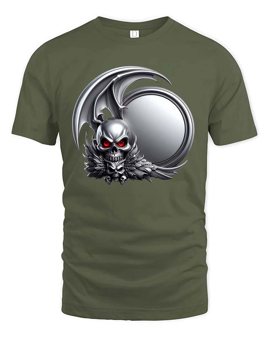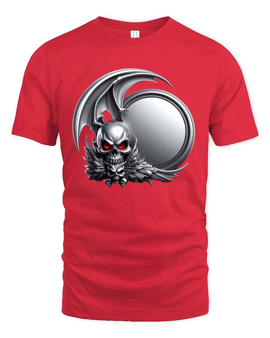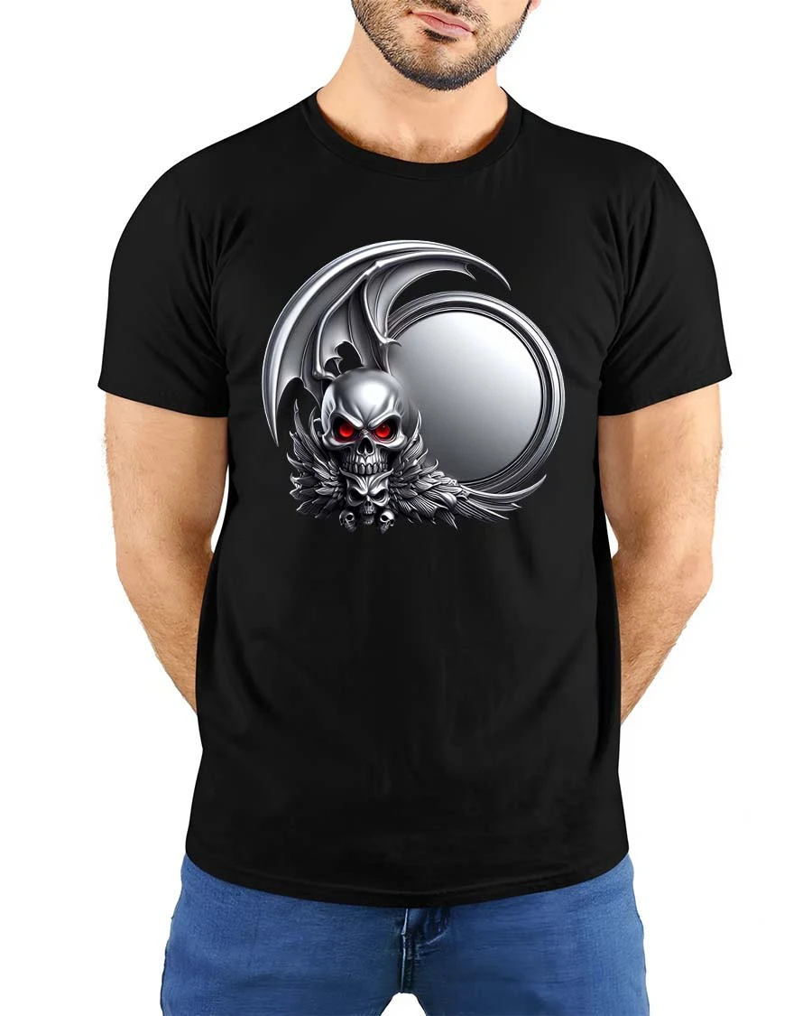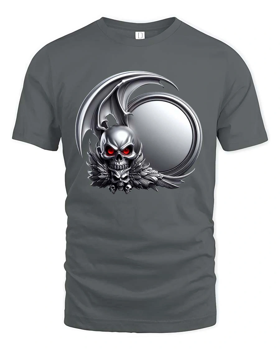 Dark Gothic Skull Winged Demon Emblem Graphic T Shirt features a powerful and dramatic skull design inspired by dark fantasy and gothic art.