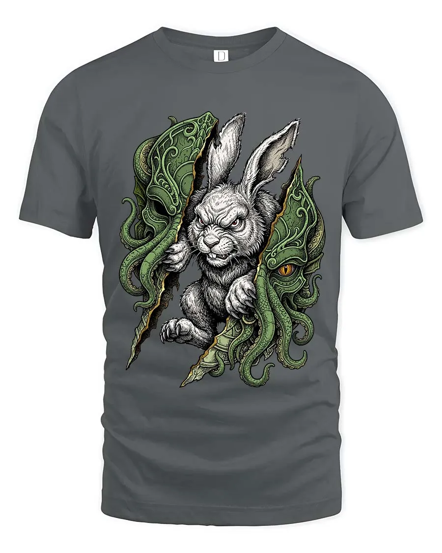 Dark Rabbit Cthulhu Graphic T Shirt Creepy Fantasy Bunny Tee delivers a bold and unsettling design inspired by dark fantasy and horror art.