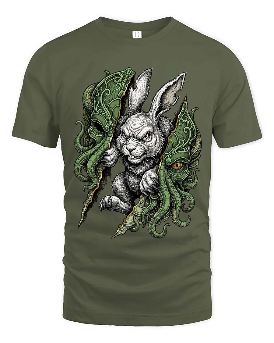 Dark Rabbit Cthulhu Graphic T Shirt Creepy Fantasy Bunny Tee - military green t-shirt on white background