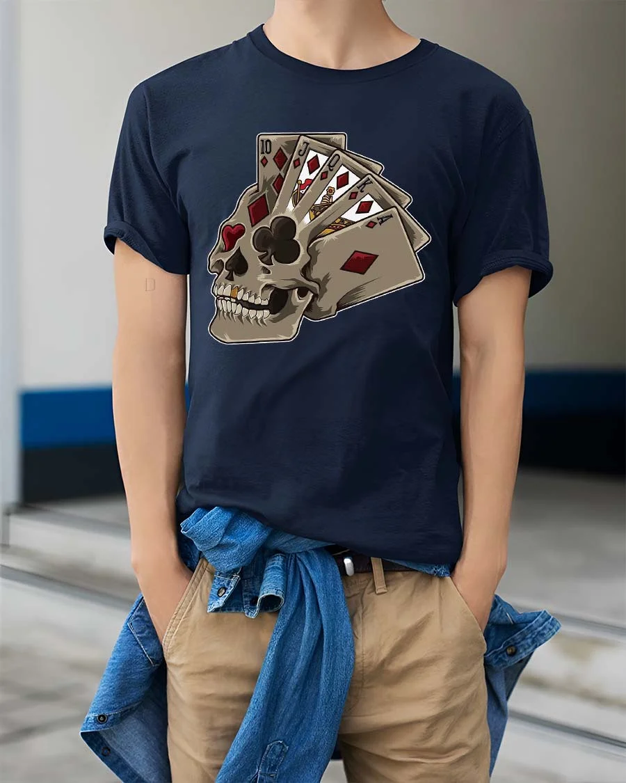 The artwork blends edgy aesthetics with classic card symbolism, making it a standout piece in any casual wardrobe.