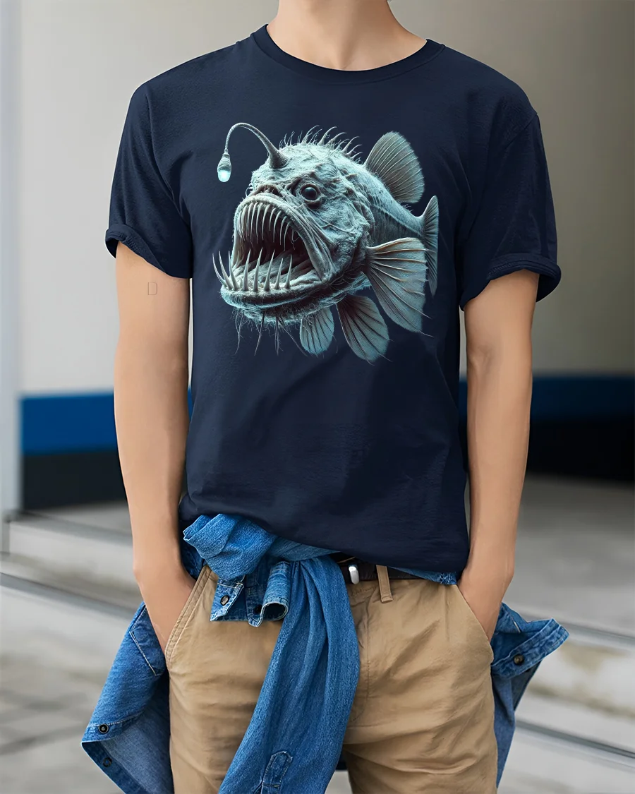 Deep Sea Anglerfish Art Graphic Tee With Fierce Ocean Creature delivers a bold and dramatic look inspired by one of the most mysterious predators of the deep. The incredibly detailed artwork captures the sharp teeth, eerie glow, and textured body of the anglerfish, creating an intense and captivating design. Rendered in icy blue tones with lifelike shading, the illustration has a chilling realism that stands out brilliantly on the tee. Crafted with soft material and high quality printing, it provides comfort while preserving the striking detail of the artwork.