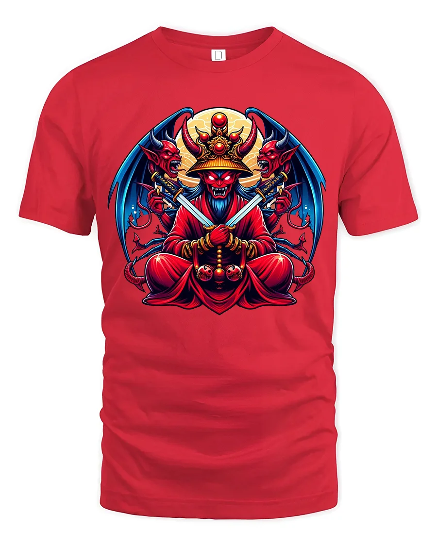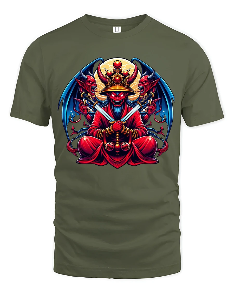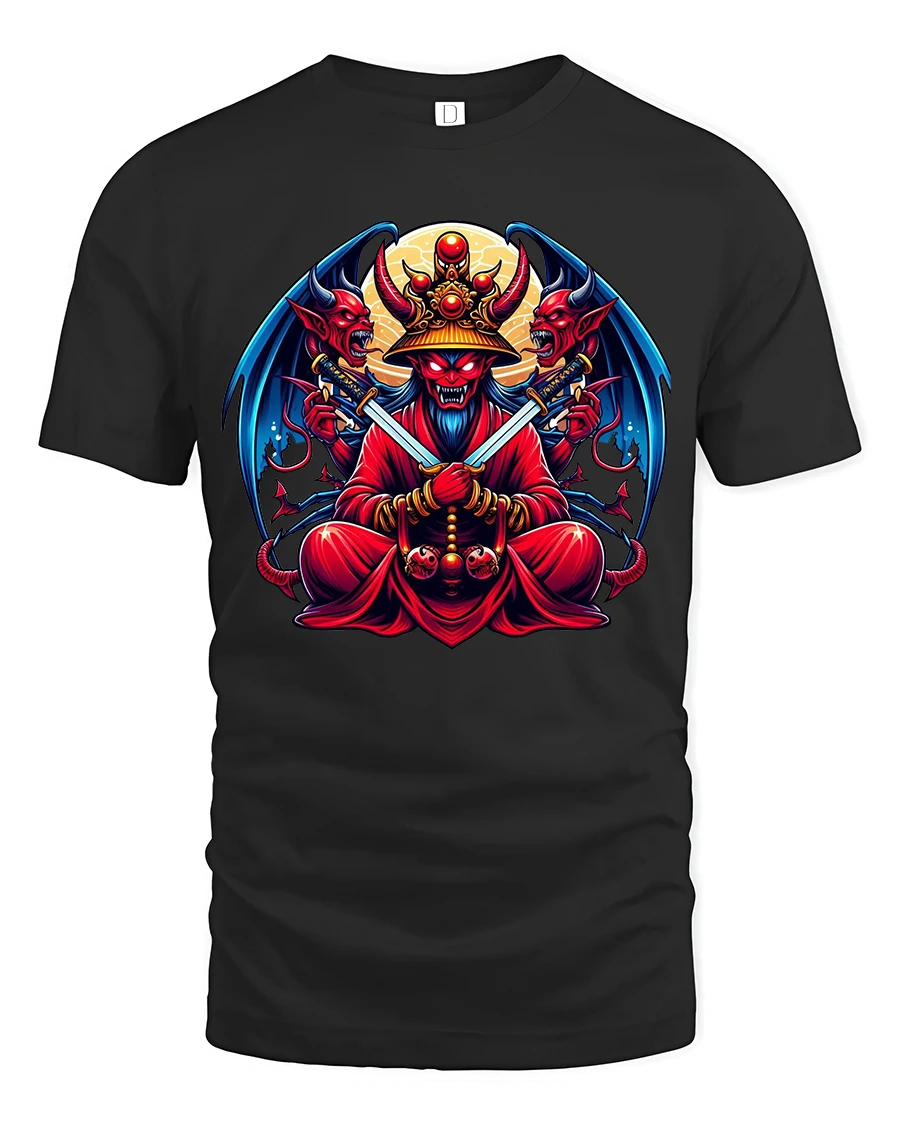 This graphic tee is ideal for fans of dark fantasy, demon mythology, and warrior inspired artwork.