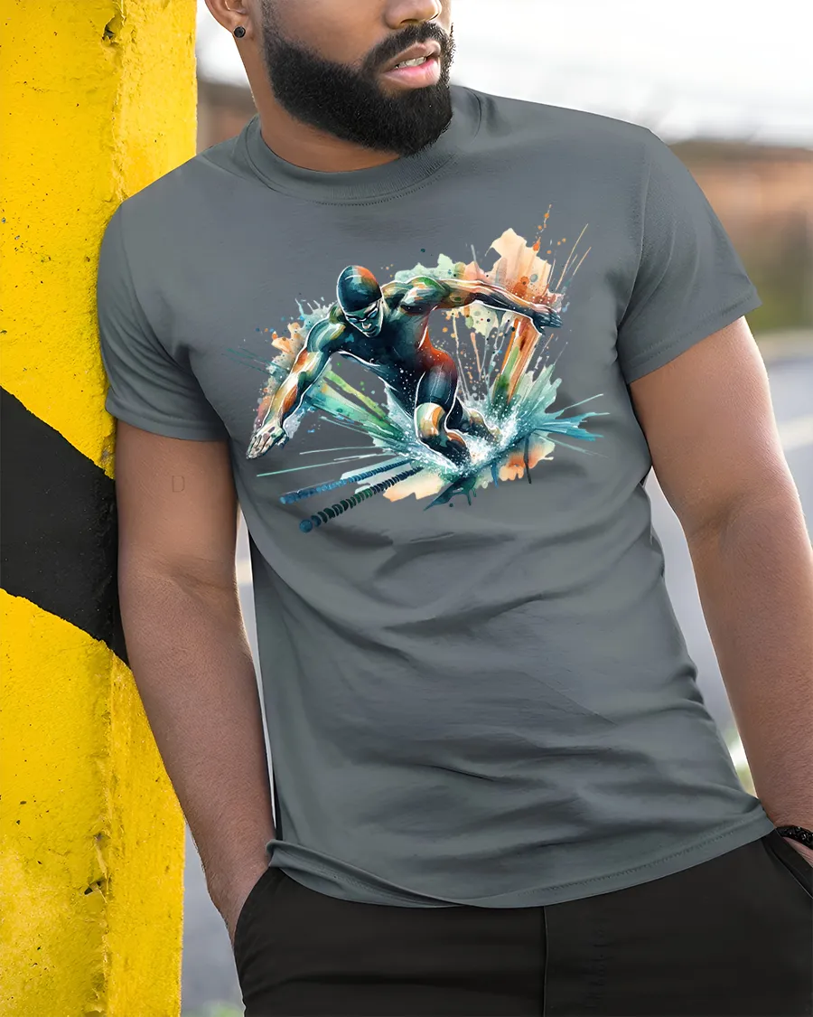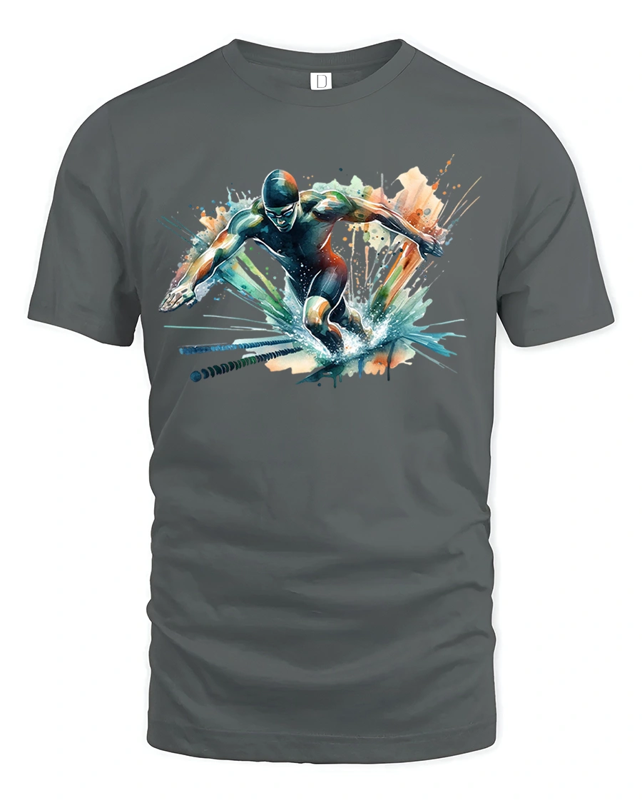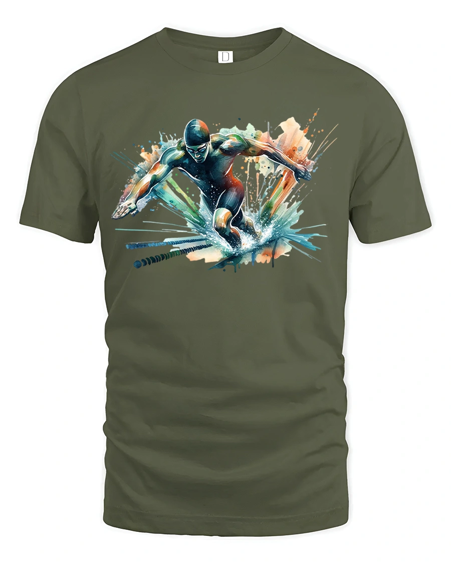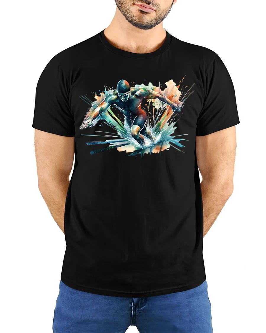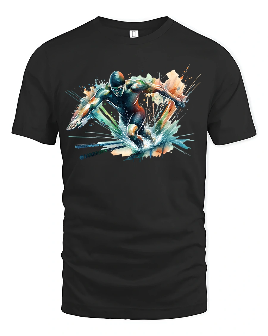 The Dynamic Swimmer Splash Action Graphic T-Shirt captures the power, speed, and intensity of competitive swimming. Featuring a bold illustration of an athlete diving through the water with energetic splash effects, this design is perfect for swimmers, coaches, and fans of aquatic sports. The vibrant colors and fluid motion give the artwork a striking and inspiring look, making it a standout addition to any sportswear collection.